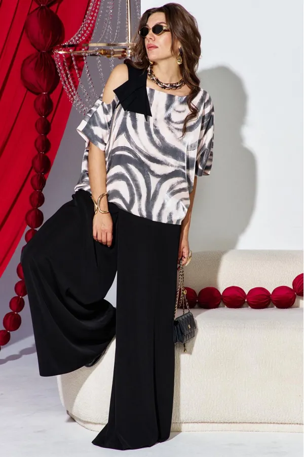 Это стильный и современный ансамбль, который состоит из блузы и брюк. Изысканный женский комплект идеален для торжественных мероприятий, он станет жемчужиной вашего гардероба. Брючный комплект можно дополнить минималистичными украшениями, которые подчеркнут утончённость, завершая этот элегантный, но уверенный образ. Блуза свободного силуэта с асимметричной формой горловины: одно плечо открыто, расположен декоративный элемент чёрного цвета из отделочной ткани. Рукав цельнокроеный. Спинка без особенностей. Блуза на подкладке. Брюки свободного кроя выполнены из плотной, матовой ткани чёрного цвета. Их широкий фасон и высокая посадка на талии создают элегантный и удлинённый силуэт, а также контрастируют с лёгким и воздушным верхом. Пояс в брюках притачной со вставкой эластичной тесьмы-резинки в бочках. По переду брюк от пояса застрачивается складка. В среднем шве брюк застёжка на потайную тесьму молнию и пуговицу в поясе. Длина блузы 56,5 см (р 52-56), 57,5 см (р 58-62), длина рукава 36,5 см (р 52-56), 37,5 см (р 58-62). Длина брюк 108 см.