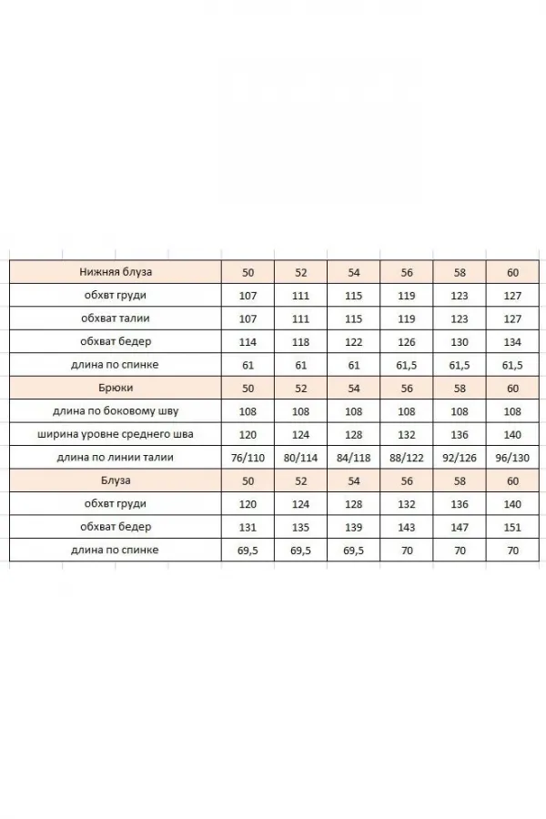 Нижняя блуза (состав: 83%вискоза, 17%полиэстер) свободного силуэта, с округлой формой горловины, нагрудными вытачками по переду блузы. Спинка без особенностей. В боковых швах разрезы. Брюки прямого силуэта со стрелками по переду. Пояс в брюках притачной с эластичной тесьмой-резинкой, которая обеспечивает максимально удобную посадку на любой тип фигуры.