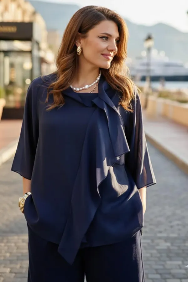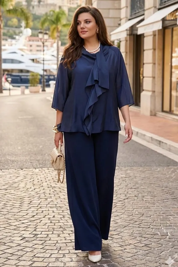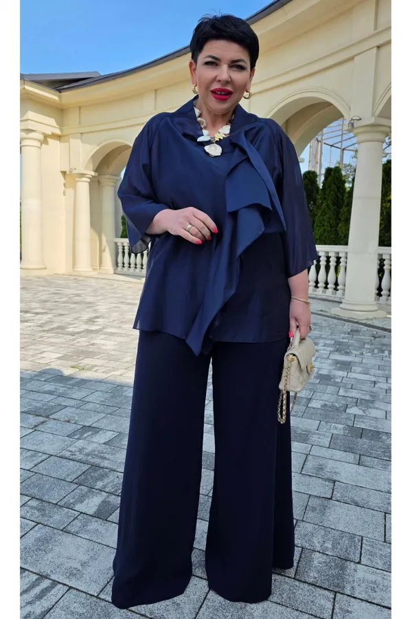 Элегантный брючный костюм, выполненный в мерцающем оттенке, который идеально подходит для создания утонченных образов. Комплект состоит из свободной блузы широких брюк палаццо, обеспечивая непревзойденный комфорт и легкость движений. Блуза привлекает внимание своим асимметричным дизайном с драпировками и широким, ниспадающим воротником, который придает образу динамичность и изысканность. Блуза свободного силуэта, с двойными деталями переда и спинки. Головина округлой формы. Рукав в блузе реглан, длиной ¾, что добавляет силуэту легкости и воздушности. В боковых швах блузы разрезы. Брюки с высокой посадкой и струящимся кроем визуально удлиняют ноги, создавая безупречный и гармоничный ансамбль. Этот костюм идеально подходит как для торжественных мероприятий, так и для деловых встреч, подчеркивая ваш безупречный вкус и чувство стиля. Длина блузы по спинке 68 см. Длина рукава блузы 48 см (р 50-54), 49 см (р 56-60). Длина брюк по боковому шву 108см (р 50-56), 108,5 см (р 58-60).
