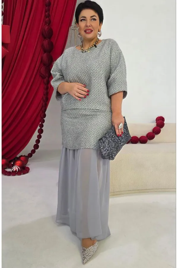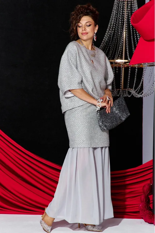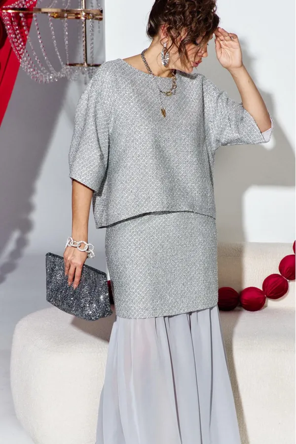 Это стильный и современный юбочный костюм, созданный для особого случая. Он состоит из трёх частей: блузы, верхней и нижней юбки. Основу ткани составляет роскошный твид глубокого серого цвета с металлическим блеском, в который искусно вплетена деликатная люрексовая нить, придающая полотну благородное мерцание. Он не только подчеркивает достоинства фигуры, но и дарит ощущение комфорта и роскоши. Блуза свободного силуэта, выполненная из плотной, фактурной ткани с серебристым блеском. Её простой крой с широкими рукавами создаёт расслабленный силуэт. Горловина в блузе округлой формы, по переду нагрудные вытачки. Спинка без особенностей. Рукав длиной ¾, широкий, фигурной формы с застроченной складкой. Низ в блузе ассиметричный. Юбка представляет собой многослойную конструкцию: верхний слой выполнен из той же блестящей ткани, что и блуза, и имеет прямой силуэт мини-длины. Нижний слой — это длинная, струящаяся юбка-макси из полупрозрачного, лёгкого шифона серого цвета. Такое сочетание фактур и длин создаёт интересный и динамичный образ. Верхняя юбка длины мини, прямого силуэта с притачным поясом со вставкой эластичной тесьмы- резинки в бочках. В среднем шве юбки застёжка на потайную тесьму-молнию и пуговицу в поясе. Юбка на подкладке. Нижняя юбка длины миди, со сборкой на резинку по верхнему срезу, с притачным воланом со сборкой от подреза. Длина блузы по спинке 59,5 см (р 50-54), 60,5 см (р 56-60), длина рукава 28,5 см. Длина нижней юбки 106 см (р 50-54), 107 см (р 56-60), длина верхней юбки 44 см (р 50-54), 45 см (р 56-60).