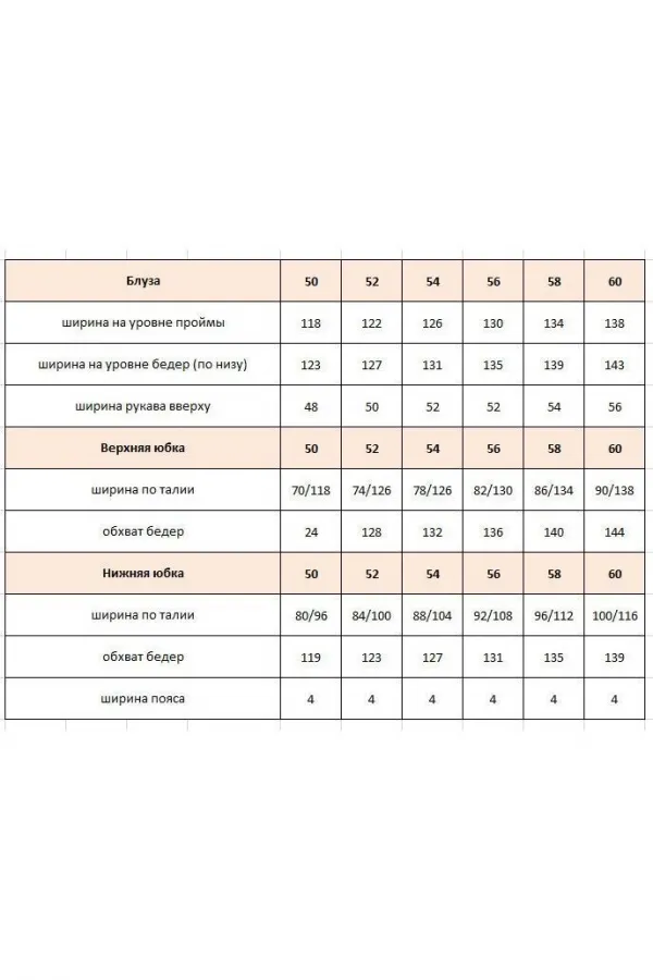 | Ткань | Блуза: 43% акрил 32% п/э 23% хлопок 2% люрекс подкладка 100% полиэстер. Верхняя юбка: 43% акрил 32% пэ 23% хлопок 2% люрекс подкладка 100% полиэстер. Нижняя юбка: 100% полиэстер. |