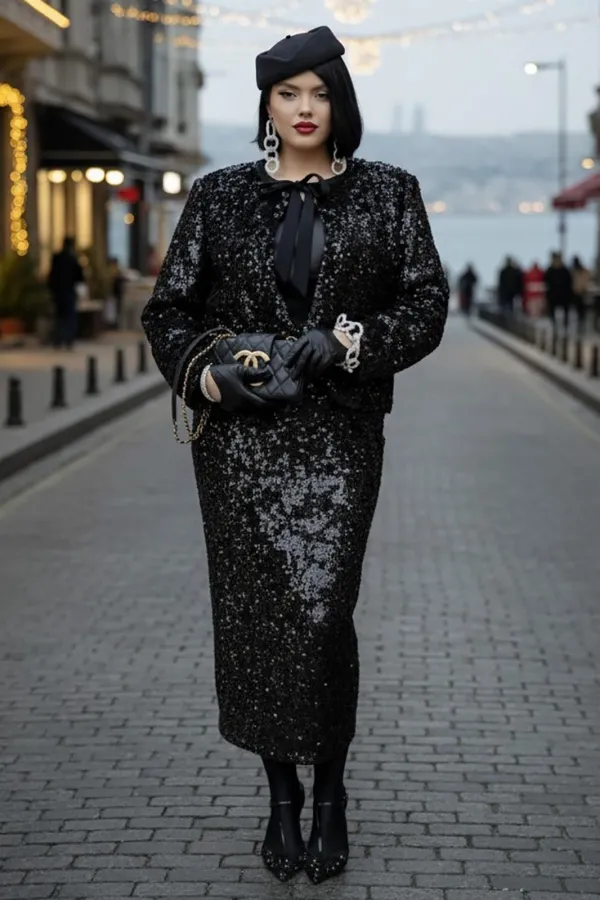 Общий образ — минимализм цвета и максимальная выразительность текстур. Материалы будто говорят на языке контраста: атласный блеск в блузе гармонично сочетается с зеркальной, перламутровой игрой пайетки. Этот комплект создает ощущение современной роскоши для вечерних выходов, деловых мероприятий и торжественных приемов, где ценят изящество без лишних деталей, спокойную уверенность и плавное движение света. Комплект женский, трёх-предметный, состоящий из жакета, блузы и юбки. Жакетукороченный, свободного силуэта, без застёжки, с акцентом на ровную линию плеч. Головина округлой формы с прилегающей стойкой из отделочной ткани, переходящей в декоративные ленты, завязывающиеся на бант. Спинка без особенностей. Рукав втачной, длинный. Жакет на подкладке. Блуза в классическом чёрном оттенке, который гармонично сочетается с насыщенным чёрным цветом комплекта. Блуза прямого силуэта с округлой формой горловины и нагрудными вытачками по полочке. Спинка без особенностей. Низ в блузе фигурной формы. Юбка длиной миди держит внимание за счет ткани, украшеной в густую, слегка крупную фактурную пайетку. Юбка прямого силуэта с притачным поясом со вставкой эластичной тесьмы-резинки в бочках. В среднем шве заднего полотнища юбки застёжка на молнию и пуговицу в поясе.Длина жакета по спинке 60 см, длина рукава 60 см. Длина блузы по спинке 65 см, длина плеча 14 см (р 50-54), 14,5 см (р 56-60). Длина юбки 79,5 см.