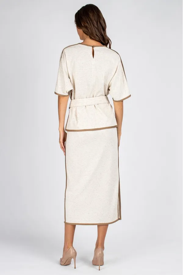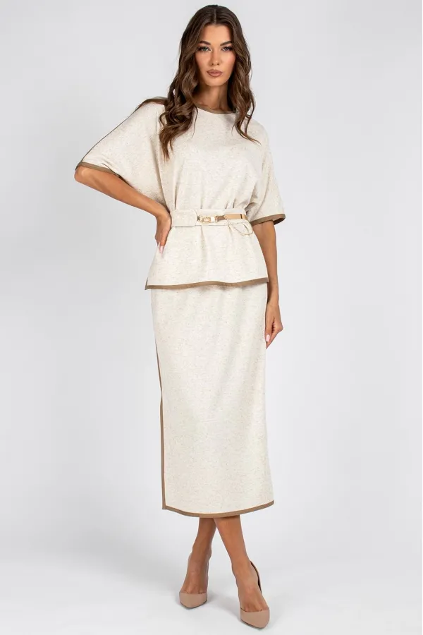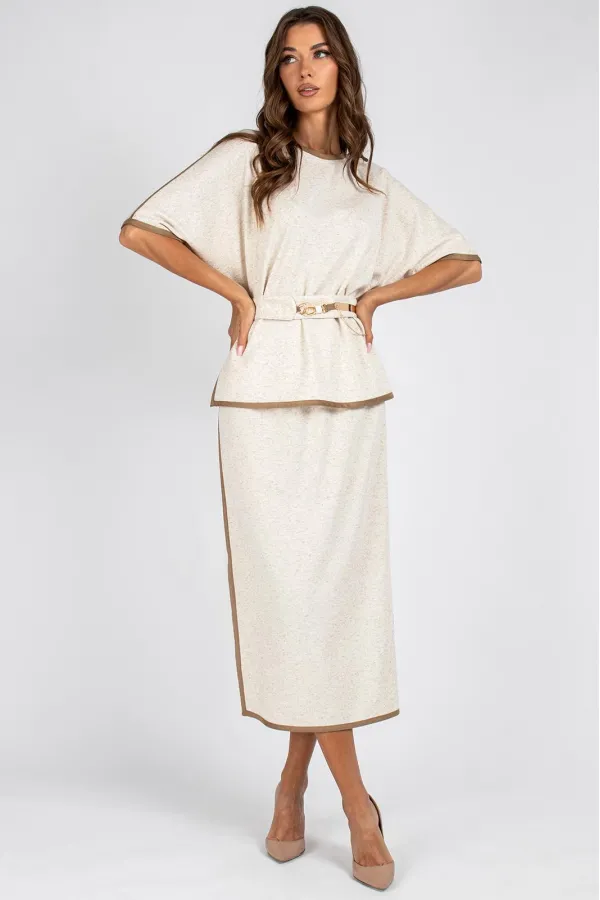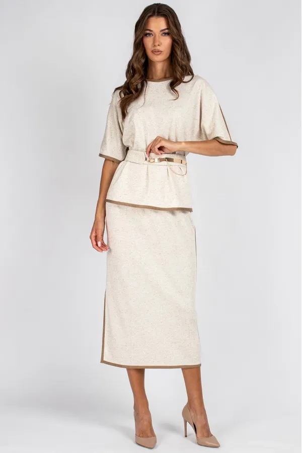 Костюм женский изготовлен из трикотажного полотна, состоит из блузона и юбки. Блузон прямого силуэта с цельнокроеным рукавом.