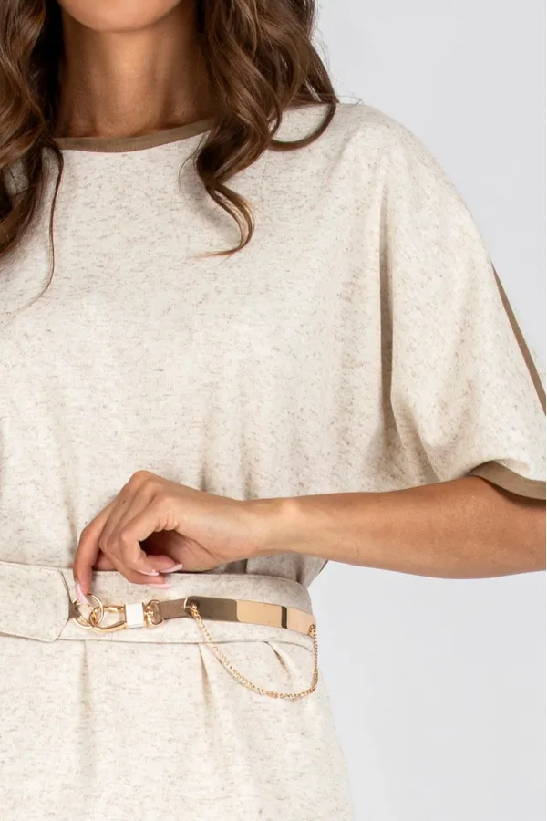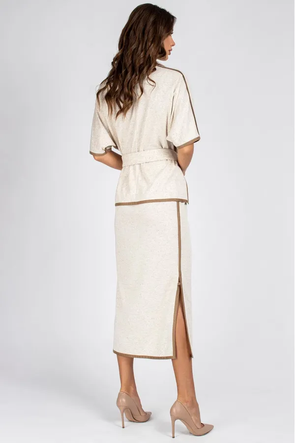 Юбка прямого силуэта, пояс с резинкой (ширина резинки 4 см.) Боковые срезы обработаны отделочной тканью. В боковом шве разрез с отделочной пуговицей без подкладки. По линии талии съемный пояс с отделочными элементами из металла (цвета золота).