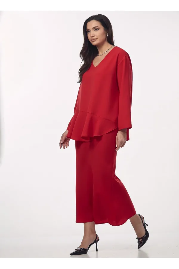 Этот элегантный юбочный костюм-двойка станет ярким акцентом вашего гардероба. Блуза свободного силуэта, с классическим V-образным вырезом горловины, который визуально удлиняет шею. По переду бузы оригинальная асимметричная баска, переходящая в мягкий вертикальный волан. Рукав втачной со спущенным плечом. Длина рукава с плечом для роста 164 см 68 см , для роста 170 см 70 см. Юбка облегающая бедра с расклешение к низу. Пояс на круговой резинке. Длина юбки от талии для роста 164 см 97 см, для роста 170 см100 см.