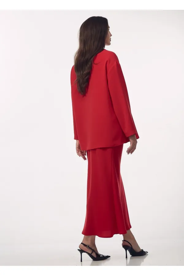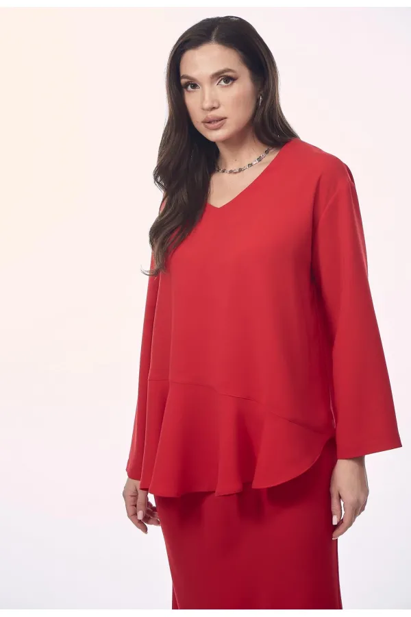 Этот элегантный юбочный костюм-двойка станет ярким акцентом вашего гардероба. Блуза свободного силуэта, с классическим V-образным вырезом горловины, который визуально удлиняет шею. По переду бузы оригинальная асимметричная баска, переходящая в мягкий вертикальный волан. Рукав втачной со спущенным плечом. Длина рукава с плечом для роста 164 см 68 см , для роста 170 см 70 см. Юбка облегающая бедра с расклешение к низу. Пояс на круговой резинке. Длина юбки от талии для роста 164 см 97 см, для роста 170 см100 см.