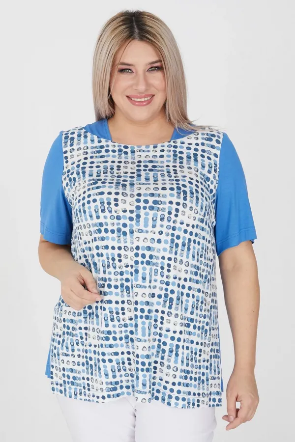 Красивая женская футболка от компании LUXURY PLUS. Стильная комбинированная футболка полуприлегающего силуэта. Основа выполнена из вискозного трикотажа в яркий принт. Прилегание по груди за счет вытачек. Вырез горловины фигурный, за счет кокетки по переду и спинке. Рукава втачные, укороченные. По боковому шву вставка, чуть короче основы. Рукава, кокетка и вставка по боковым швам выполнены из однотонного трикотажа, что делает модель интересной и расставляет акценты. Модель отлично сочетается с джинсами, брюками или юбками. Яркий и комфортный вариант для жаркого лета!