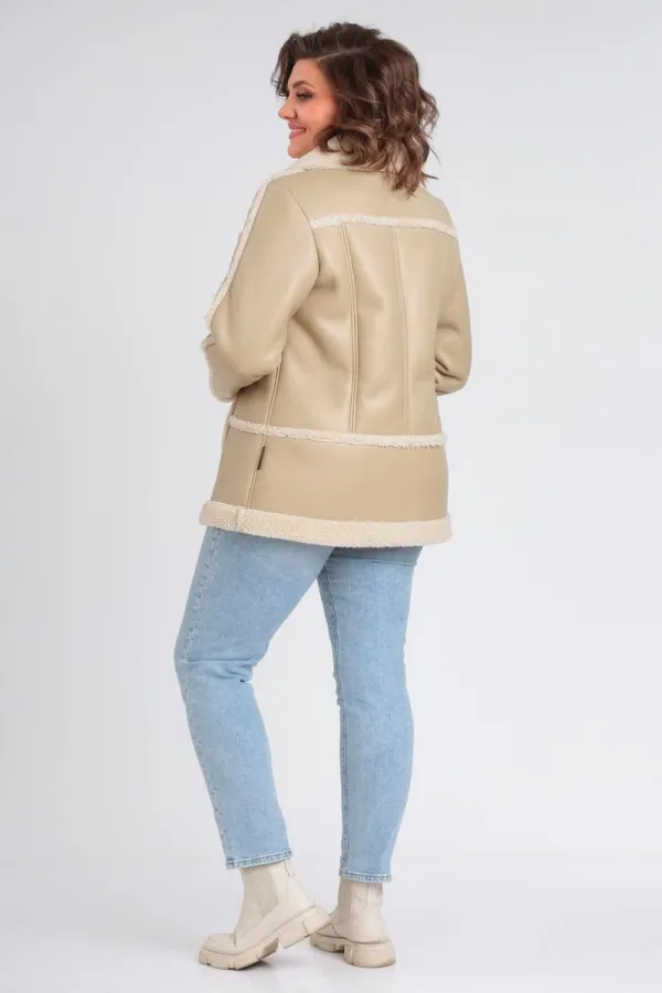 Воротник втачной пиджачного типа. Полочка и спинка отрезные чуть ниже линии талии, на спинке кокетка. Застежка двубортная на петли и пуговицы. Рукав втачной двухшовный. На полочке расположены разрезные карманы в рамку. В модели есть прибавка на верхнюю одежду.