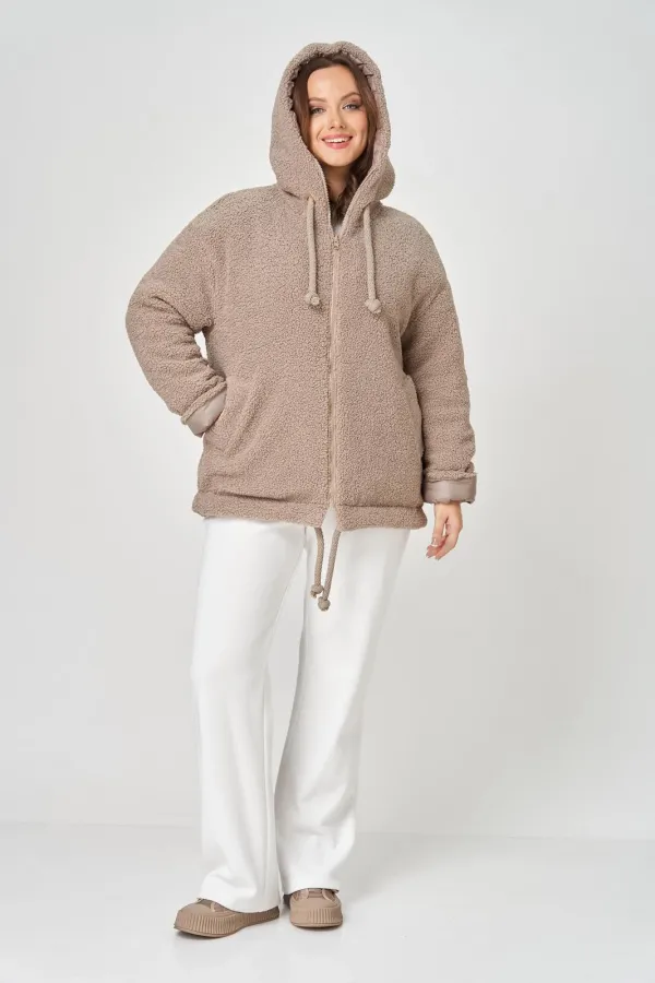 Куртка женская с центральной застёжкой на тесьму-молнию. Двусторонняя. Линия плеча спущена. Рукав втачной одношовный. По переду прорезные карманы с листочкой. Капюшон с центральной частью , по отлету-кулиса. По низу изделия - кулиса. Используется две ткани. Одна сторона простёганная плащёвка, вторая сторона искусственный мех. Длина по спинке 70 см. , длина рукава 56 см.Параметры изделия в готовом виде представлены на фото.