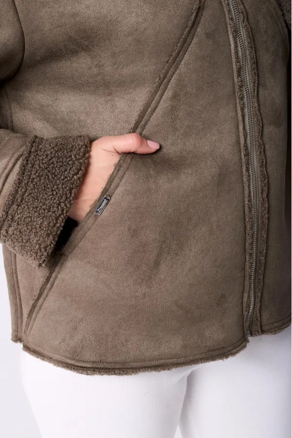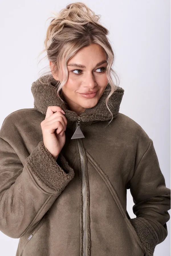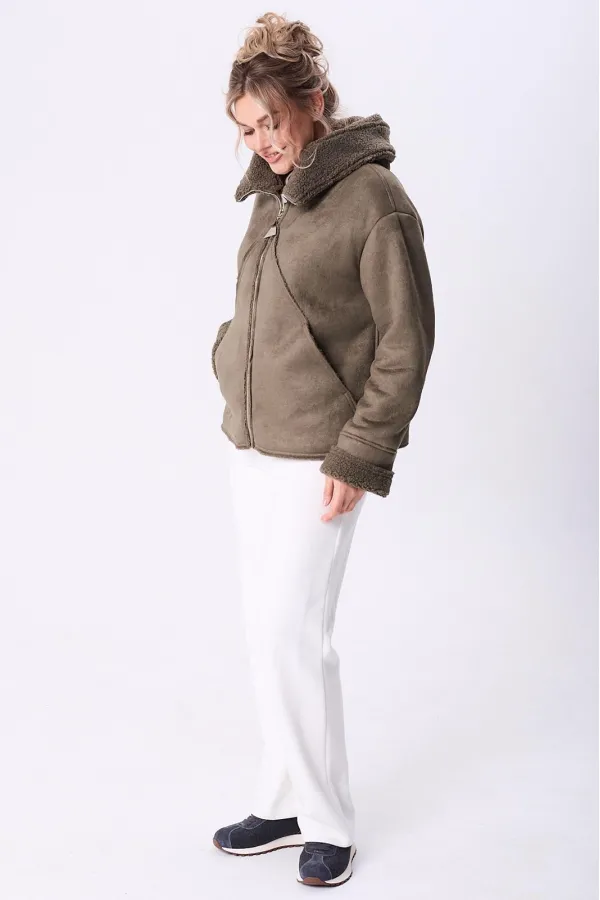 Кардиган женский полуприлегающего силуэта с центральной застежкой на тесьму-молнию. По спинке средний шов, вытачки по горловине. По переду накладные карманы фигурной формы. Рукав втачной 2-шовный с притачным манжетом, спущенная линия плеча. Капюшон с центральной частью и отрезной отделочной деталью по отлету. В качестве отделки используется фурнитура. Длина по спинке 60 см. Длина рукава 62 см.