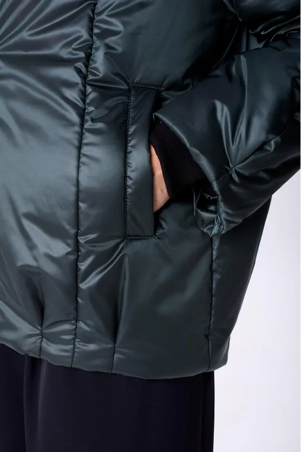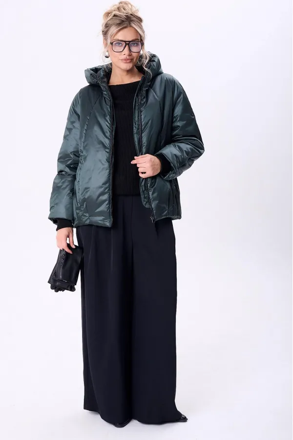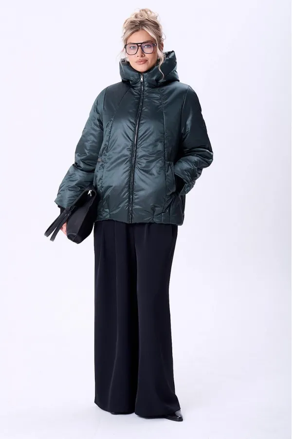 Куртка женская с центральной застежкой на тесьму-молнию. По спинке рельефные швы от горловины до низа, по низу заложены складки. По переду рельефные швы от горловины до низа, по низу заложены складки, обработаны карманы с втачной вытачкой. Рукав полуреглан 2шовный. Капюшон с центральной частью и отделочной деталью по отлету. В качестве отделки используется фурнитура. Утеплитель синтепон 150 гр.Длина по спинке 73 см. Длина рукава 65 см.
