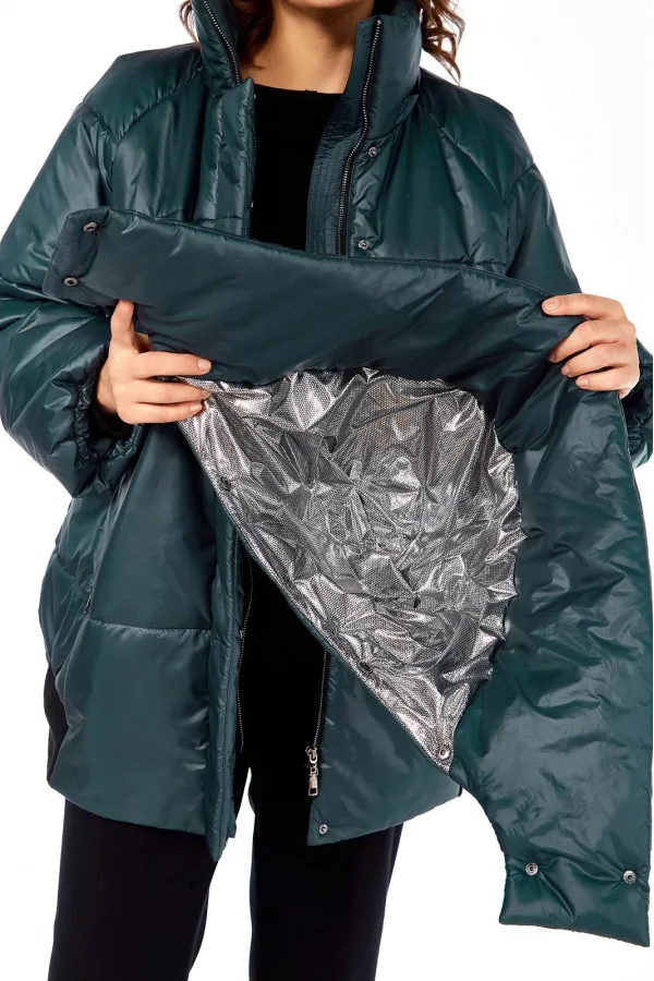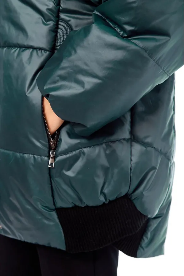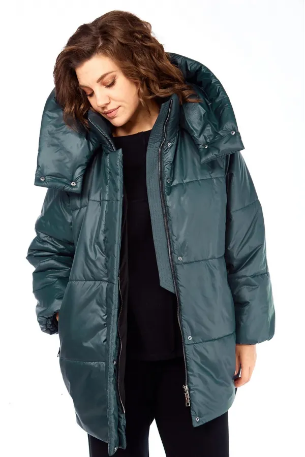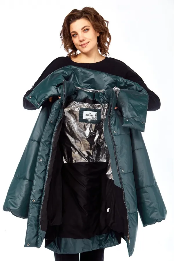 Куртка женская, прямого силуэта с рукавом реглан. Застежка центральная на тесьму молнию и планку с кнопками. По спинке рельефные швы. По переду рельефные швы, в швах карманы с молнией и отделочной деталью, по низу боковых швов-довяз. Рукав реглан с вытачкой и манжетом(довяз)- по низу. Воротник стойка. Капюшон с центральной частью, с отделочной деталью по отлету (застежка на кнопки)-съемный, фиксируется с помощью кнопок. На центральной части под молнией -ветровик. В качестве отделки используется фурнитура и детали. Температурный режим до -10 градусов. Длина по спинке 85 см, длина рукава 72 см.