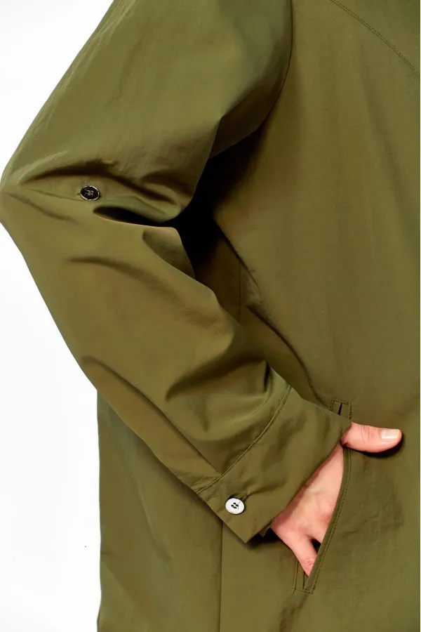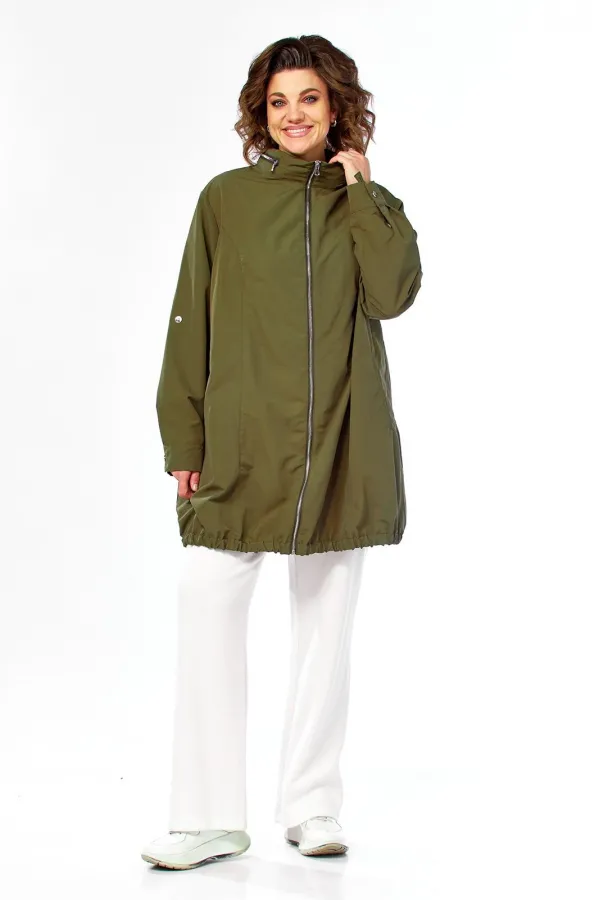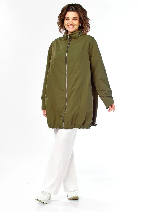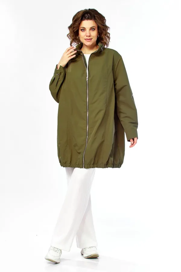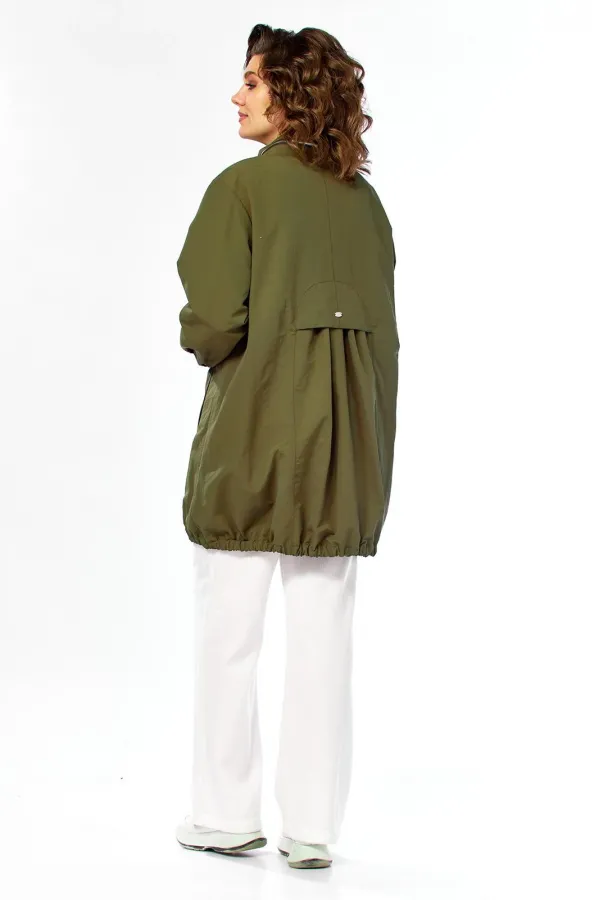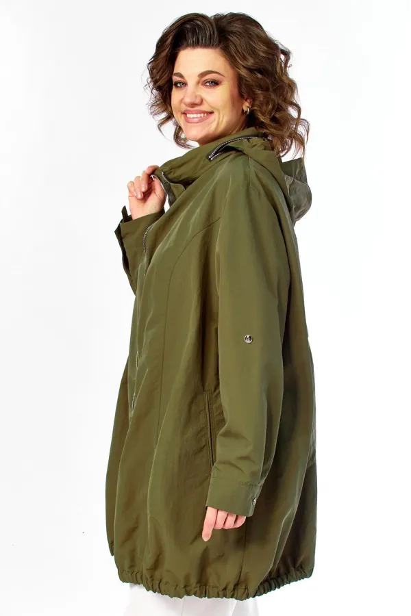 Парка женская свободного кроя с центральной застежкой на молнию. Перед с рельефными швами и боковыми карманами в рамку.Спинка со средним швом до талии и отрезной центральной частью сосборенными складками сверху. Рукав втачной одношовный с манжетом и хлястиками внутри, с возможностью регулировать длину рукава. Воротник-стойка с молнией, внутри стойки есть капюшон. Парка без подкладки. Фурнитура может отличаться от заявленной на фото. Длина по спинке 85 см. Длина рукава 62 см.