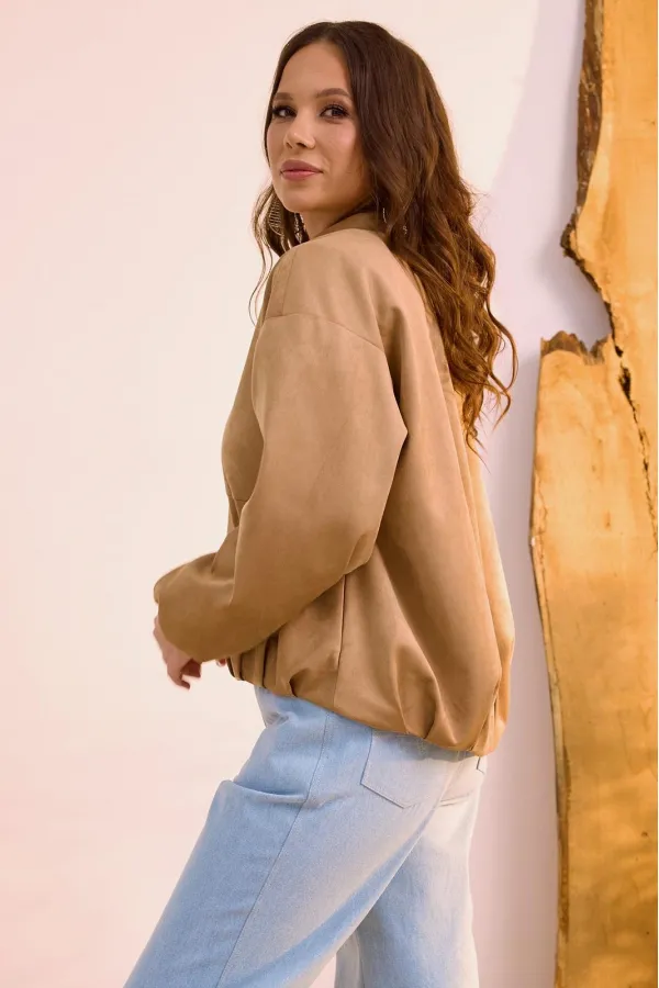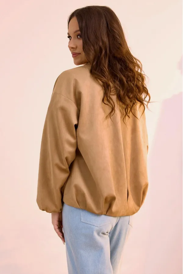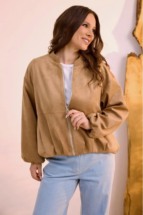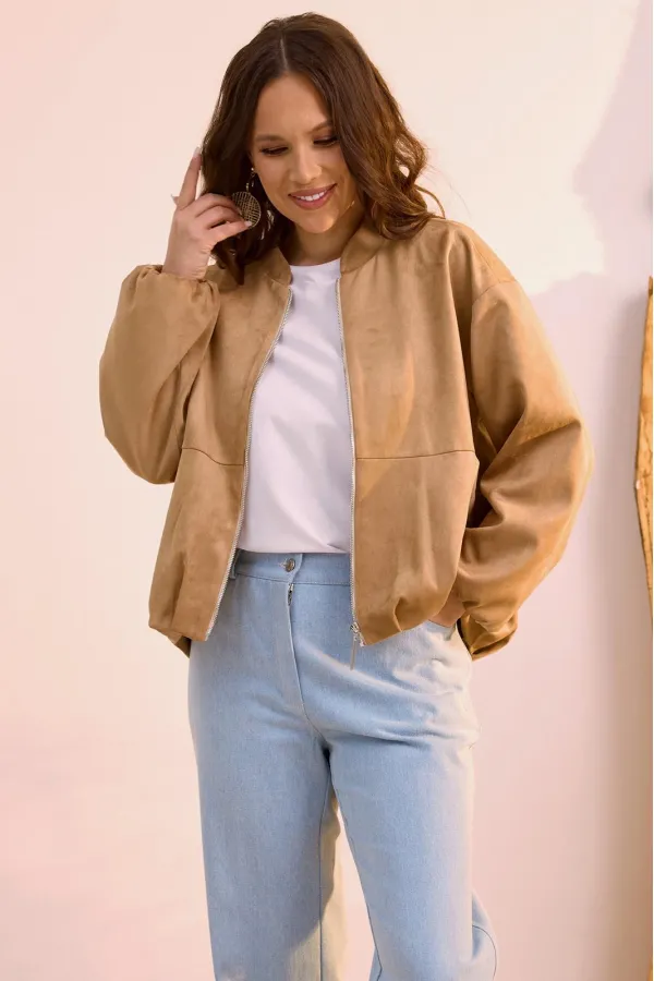 Стильная замшевая куртка в топовом оттенке, которая так популярна в этом сезоне. Выполнена из текстильной замши премиум качества на подкладке без утеплителя. Можно использовать как бомбер и носить под верхнюю одежду. Куртка с центральной застежкой на металлическую молнию. Горловина обработана стойкой. Рукав втачной, слегка спущен. Перед куртки короче спинки. Куртка дополнена боковыми карманами. Длина куртки от плечевого шва по переду 60 см., по спинке 66 см. Длина рукава 61 см.