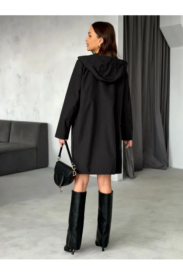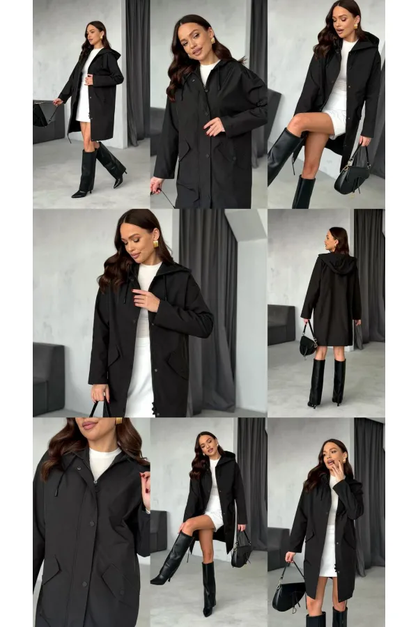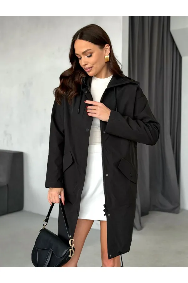 Куртка женская из текстильной ткани (водоотталкивающая) прямого силуэта. По переду расположены декоративные подрезы с прорезными карманами. Спинка состоит из 2-ух частей. На верхней части расположена кокетка и настрочной элемент (возможно изменение элемента-нашивки). Нижняя часть со средним швом. Спущенное плечо, рукав прямой. Вырез горловины оформлен капюшоном с блочками и шнуром. Куртка с планкой, застегивается на молнию и кнопки. По низу изделия расположен шнур с наконечниками.