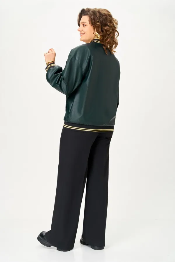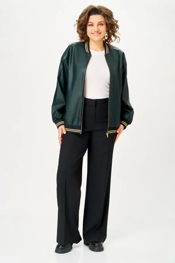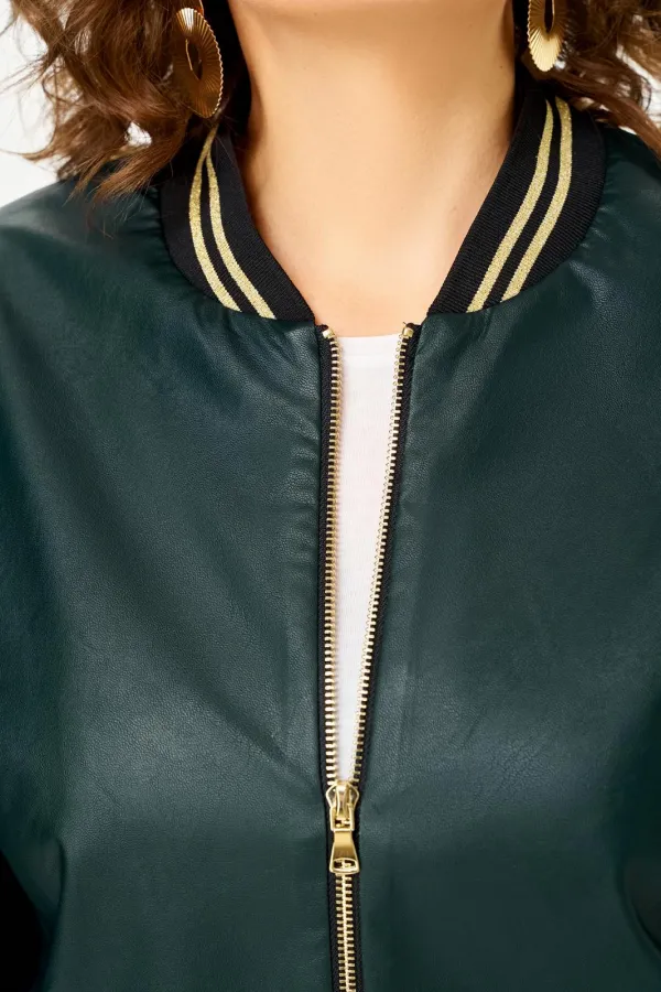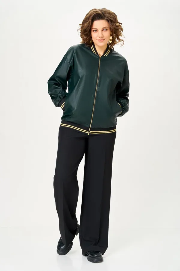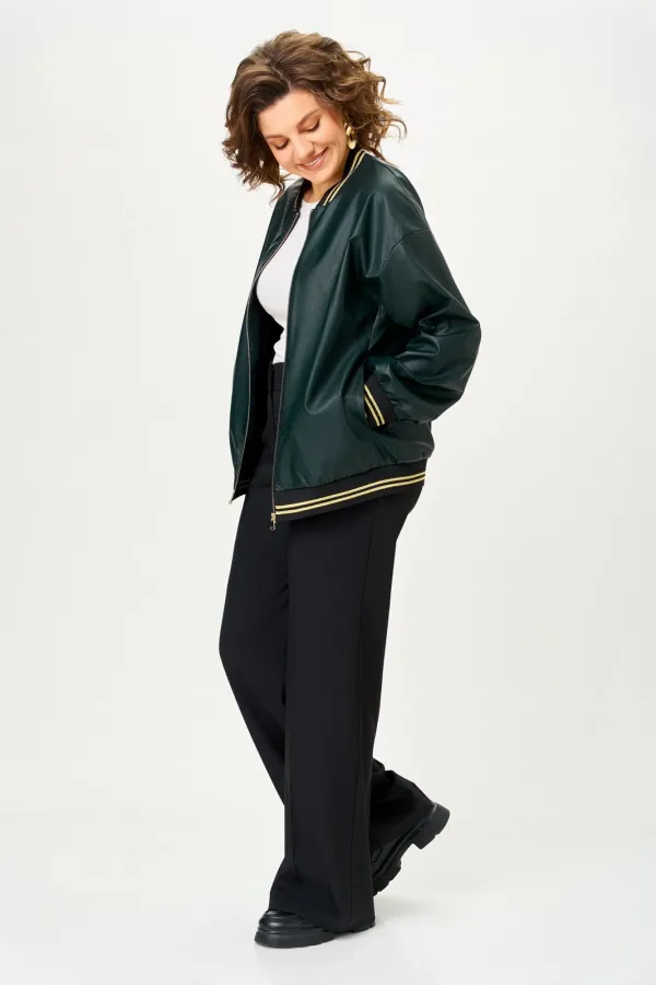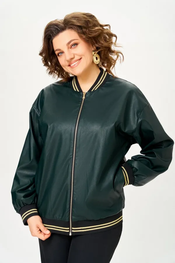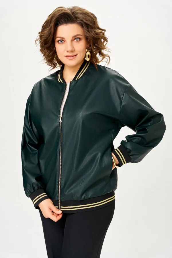 Бомбер женский из мягкой экокожи на подкладке свободного кроя со спущенной линией плеча и с центральной застёжкой на декоративную металлическую молнию. Полочка с отрезными бочками и карманами в швах. Горловина округлая со стойкой из трикотажного довяза. Рукав длинный. По низу рукава и изделия - довяз.