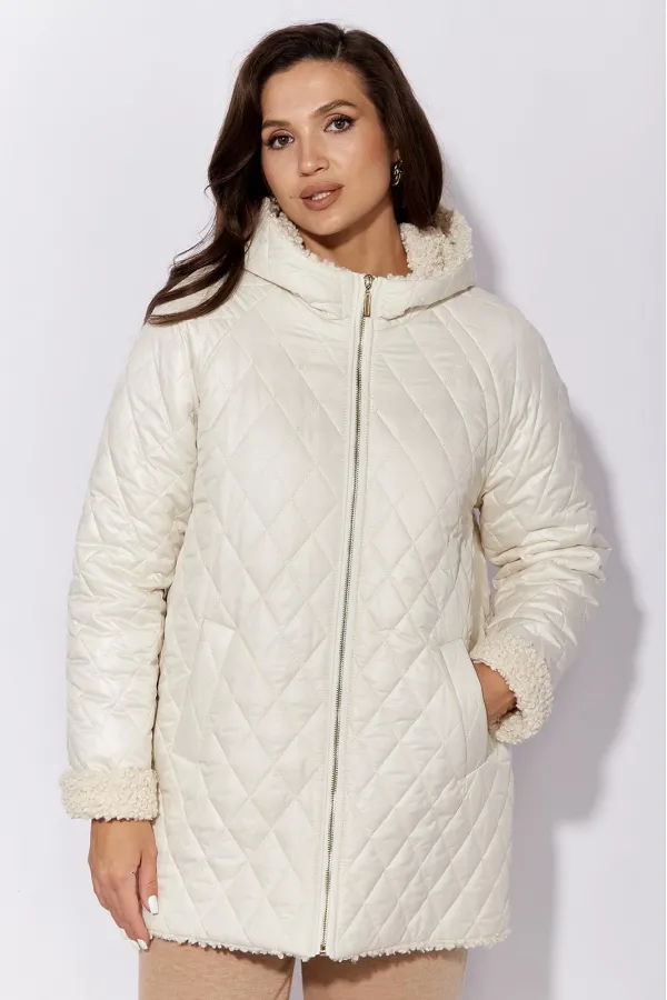Куртка женская, демисезонная. Верх куртки - плащевка, стеганная на синтепоне. Подкладка - экомех барашек. Куртка прямого силуэта с длинным рукавом реглан. Длина рукава может регулироваться отворотом. По переду центральная застежка на молнию и прорезные, функциональные карманы. Горловина оформлена капюшоном-стойкой по переду.