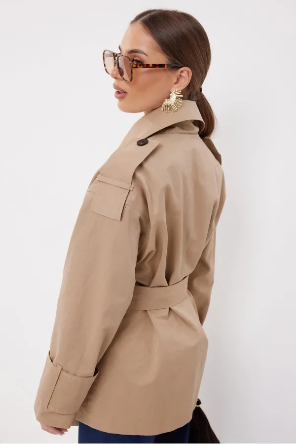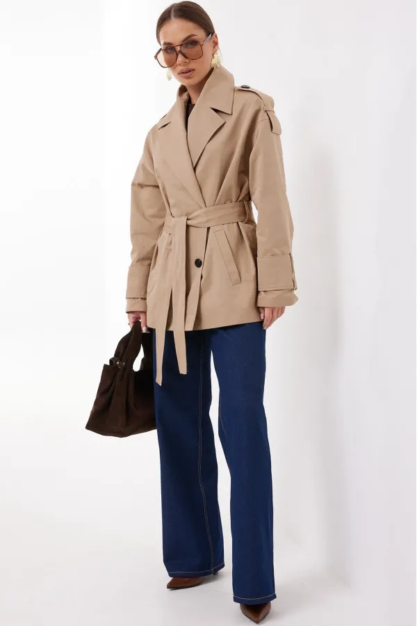 Жакет двубортный. Застёжка на петли и пуговицы-болты. Воротник пиджачного типа. По переду прорезные карманы. Рукав прямой, по низу рукава пата со шлёвками. Погон по плечевому шву, на петлю и пуговицу-болт. В комплекте завязывающийся пояс. Жакет на подкладке.
