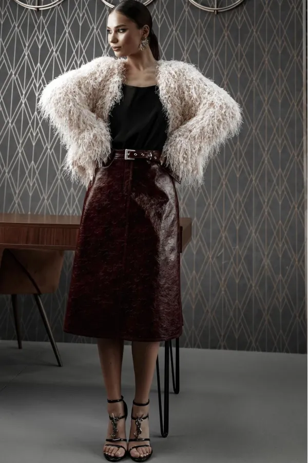 Жакет женский, из костюмно-плательной ткани с эффектом «травка», укороченный, прямого силуэта с центральной застежкой на три кнопки. Рукава длинные, слегка расширенные книзу, жакет на подкладке. Жакет прекрасно дополнит любой вечерний образ.