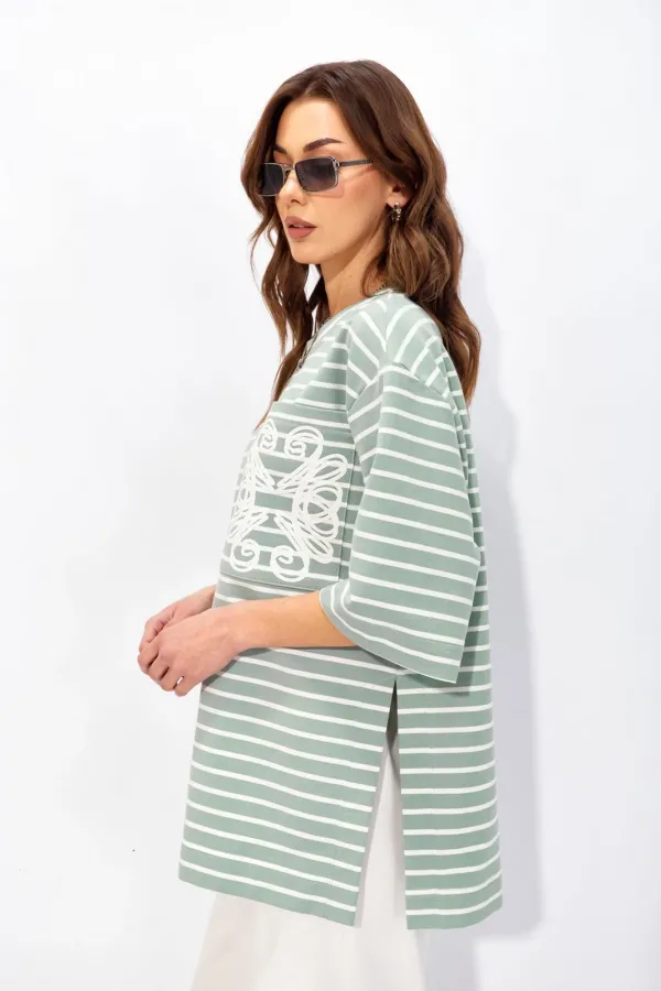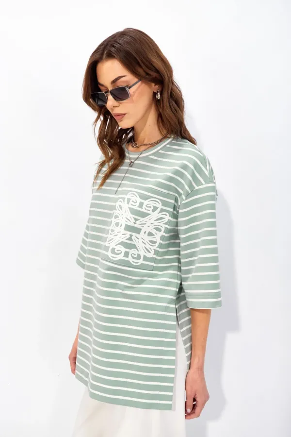 Джемпер прямого свободного силуэта со спущенной линией плеч из хлопкового трикотажного полотна в полоску. Вырез горловины округлый с притачной бейкой. По бокам высокие разрезы до талии. На кармане фактурная дизайнерская печать.