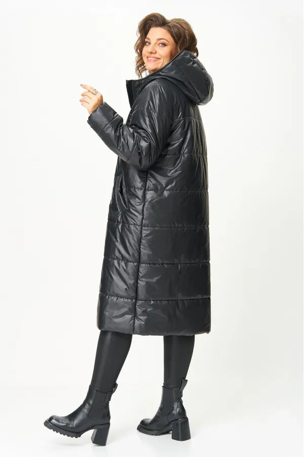 Полочка с центральной застежкой на молнию и притачной планкой с застежкой на кнопки. На полочке выполнены карманы с листочкой. Спинка цельная . Пальто с капюшоном. Рукав одношовный, втачной, по низу рукава, с внутренней стороны настрочена резинка. Пальто на подкладке.