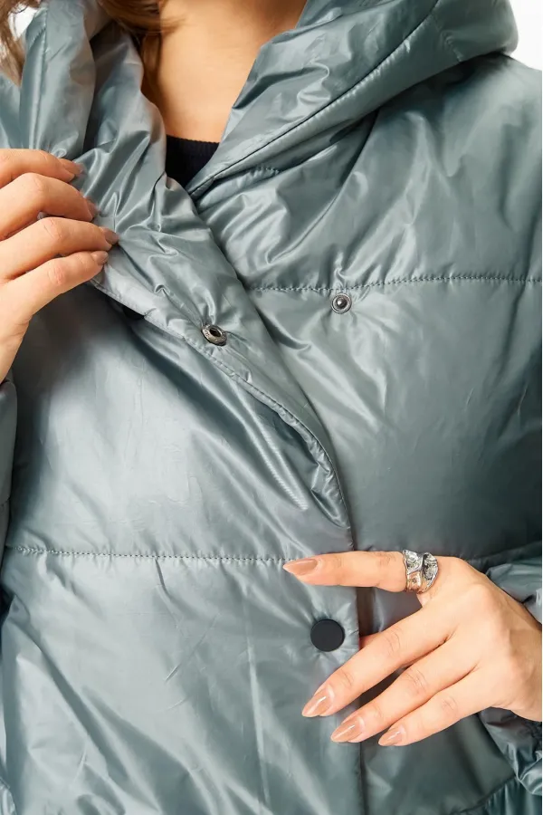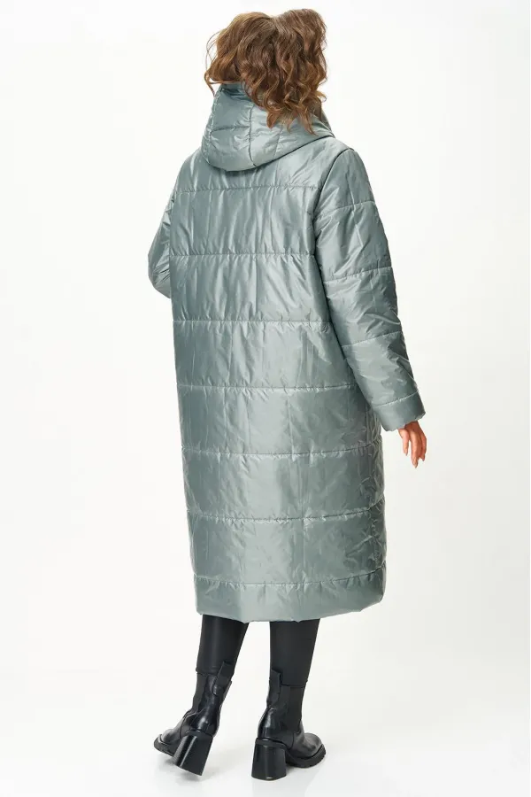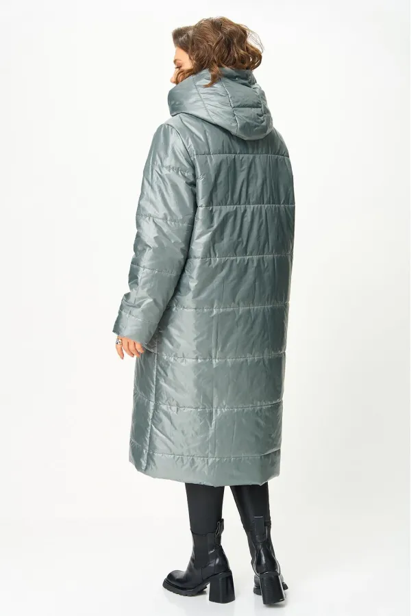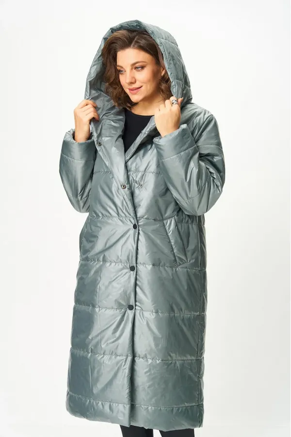 Полочка с центральной застежкой на кнопки. На полочке выполнены карманы с листочкой. Спинка цельная. Пальто с капюшоном. Рукав одношовный, втачной, по низу рукава, с внутренней стороны настрочена резинка. Пальто на подкладке.