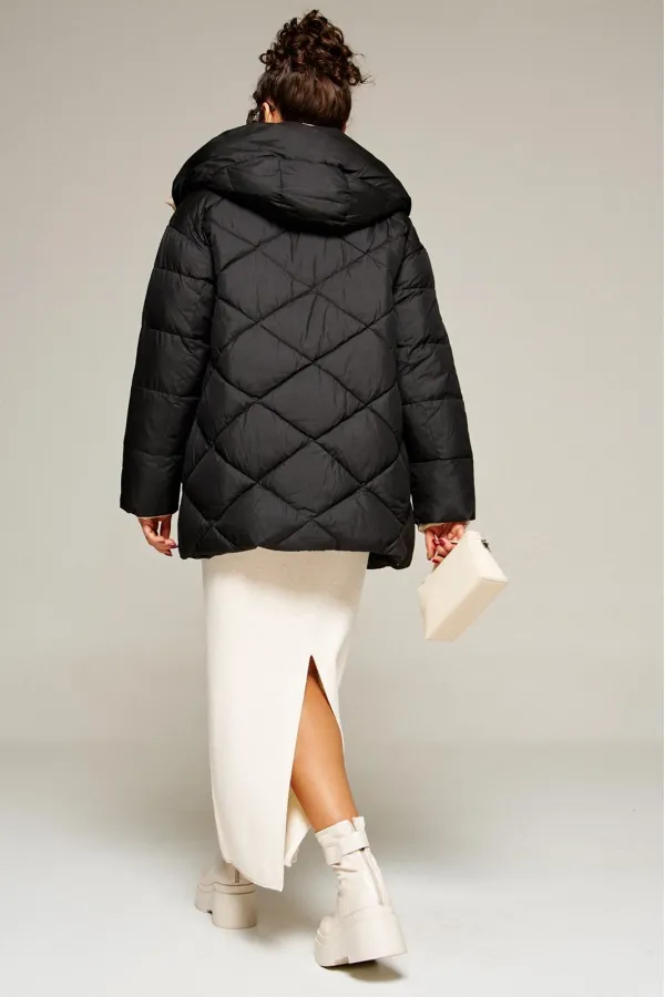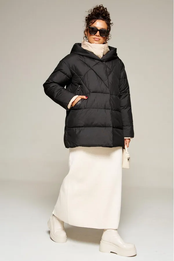 Застежка центральная на двустороннюю молнию от уровня груди до низа и кнопки по краю борта.