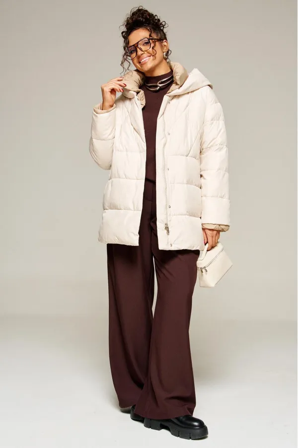 Застежка центральная на двустороннюю молнию от уровня груди до низа и кнопки по краю борта.