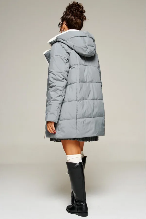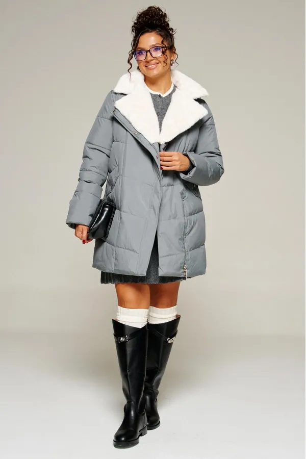 Воротник пиджачного типа с возможностью застегивания до верха. Внутренняя часть воротника и лацканы обработаны искусственным мехом.