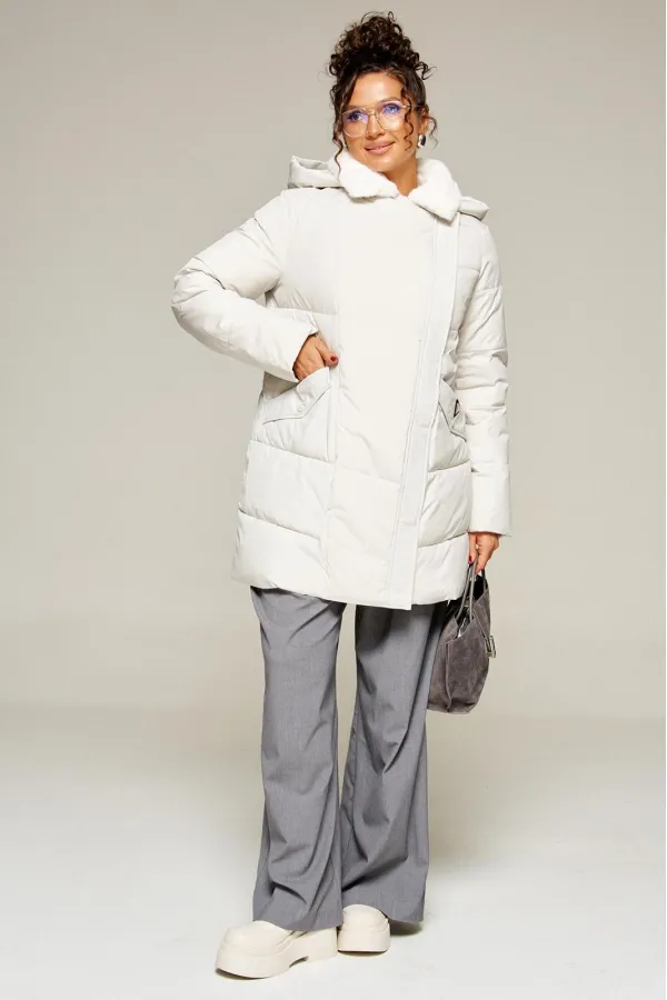 Воротник пиджачного типа с возможностью застегивания до верха. Внутренняя часть воротника и лацканы обработаны искусственным мехом.