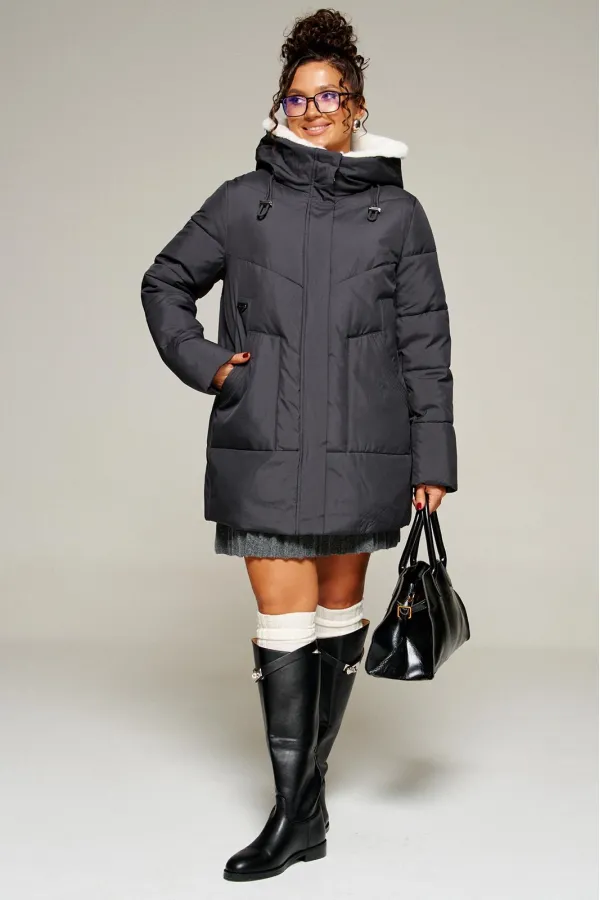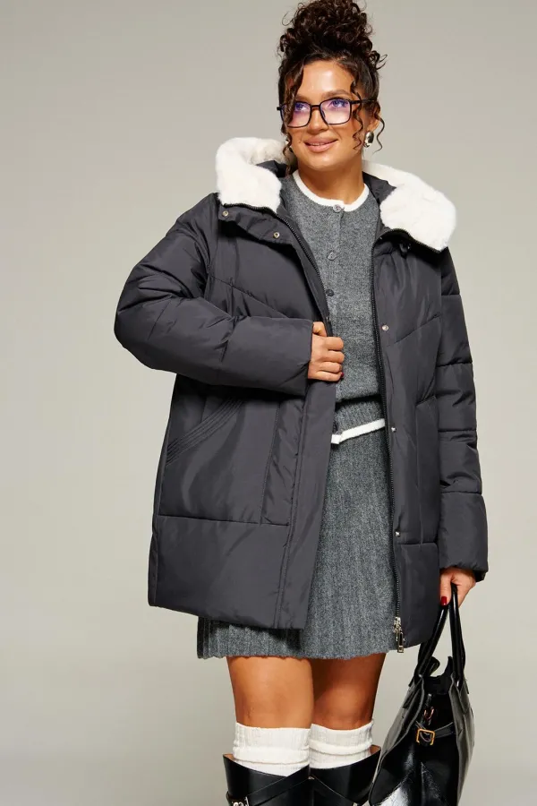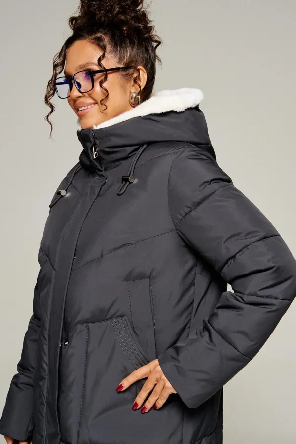 Капюшон с застежкой спереди умеренного объема. По периметру капюшона с внутренней стороны выполнена оторочка из искусственного меха, которая выполняет декоративную и защитную функции, создавая дополнительное тепло и защиту от ветра и холода.