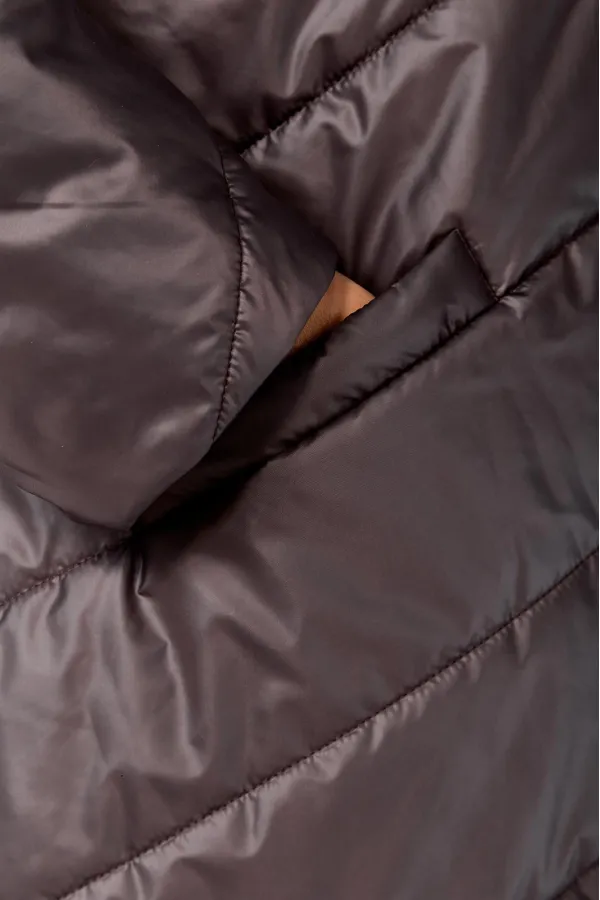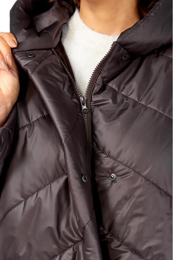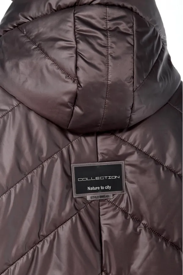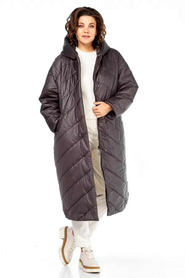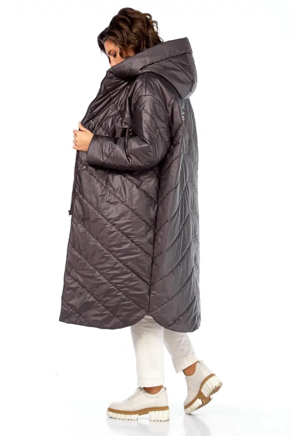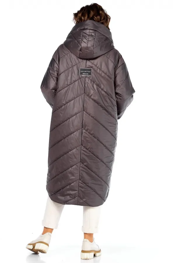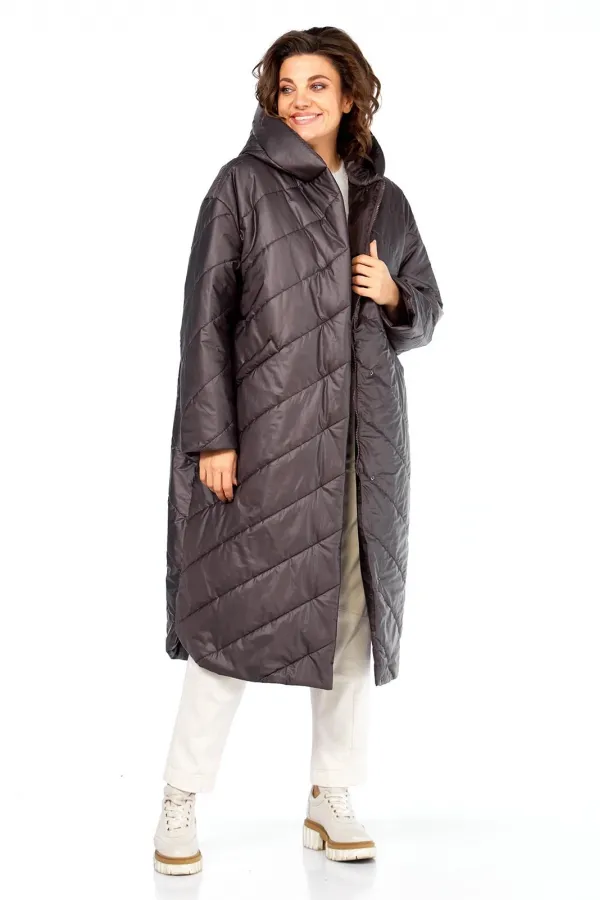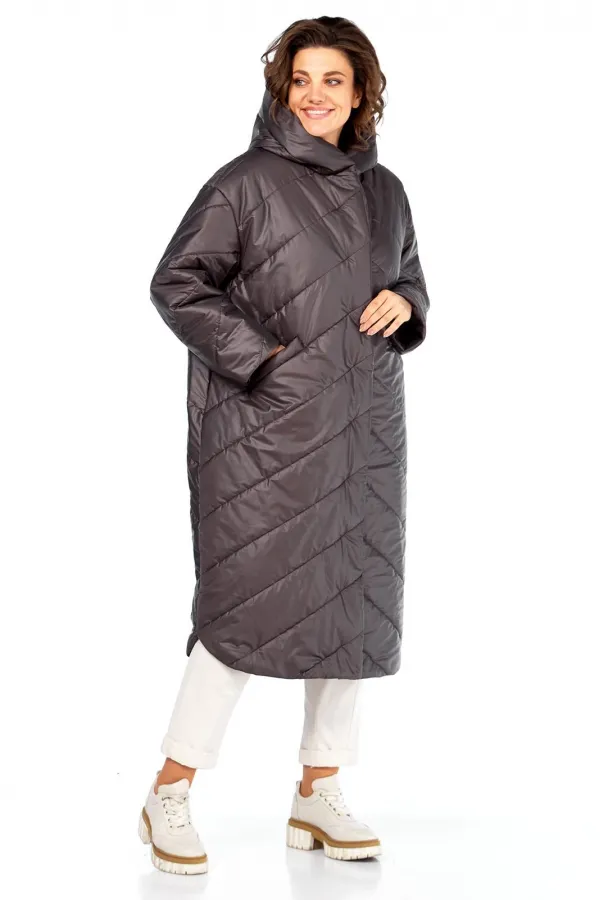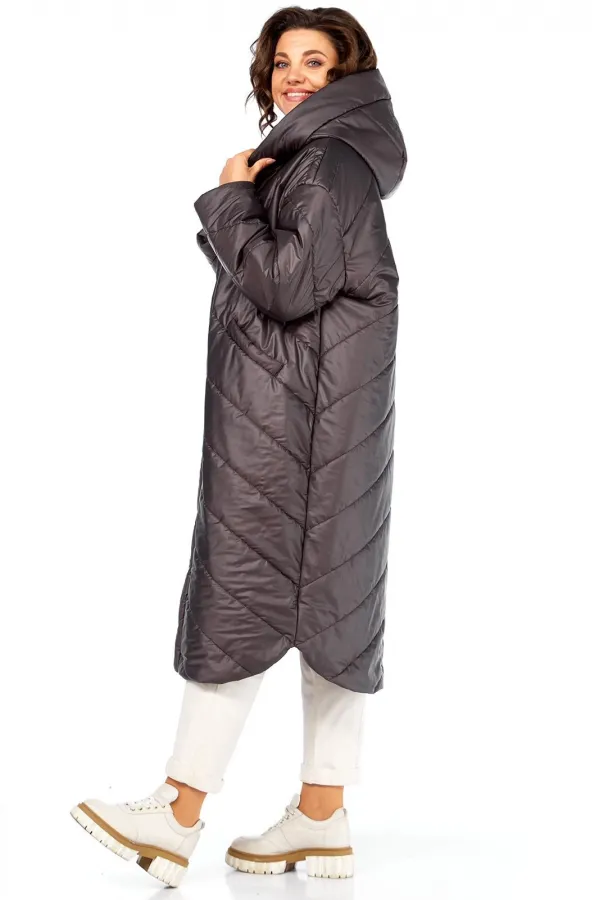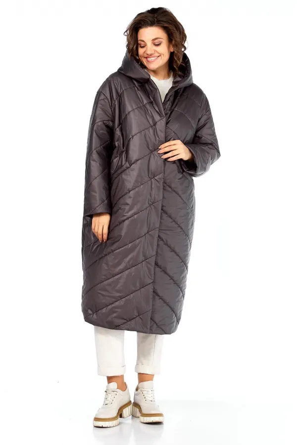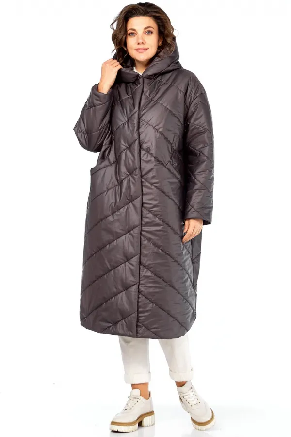 Пальто женское, прямого силуэта со смещенной застежкой на молнию (внутренняя) и кнопки. Линия плеча спущенная, рукав втачной одношовный. По переду карманы с личточкой. По спинке средний шов. Капюшон с центральной частью и отделочной деталью по отлету. В качестве отделки используется фурнитура и детали. Утеплитель- синтепон 150 гр. Длина по спинке 113 см. Длина рукава 54 см.