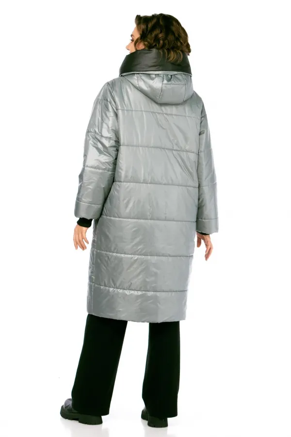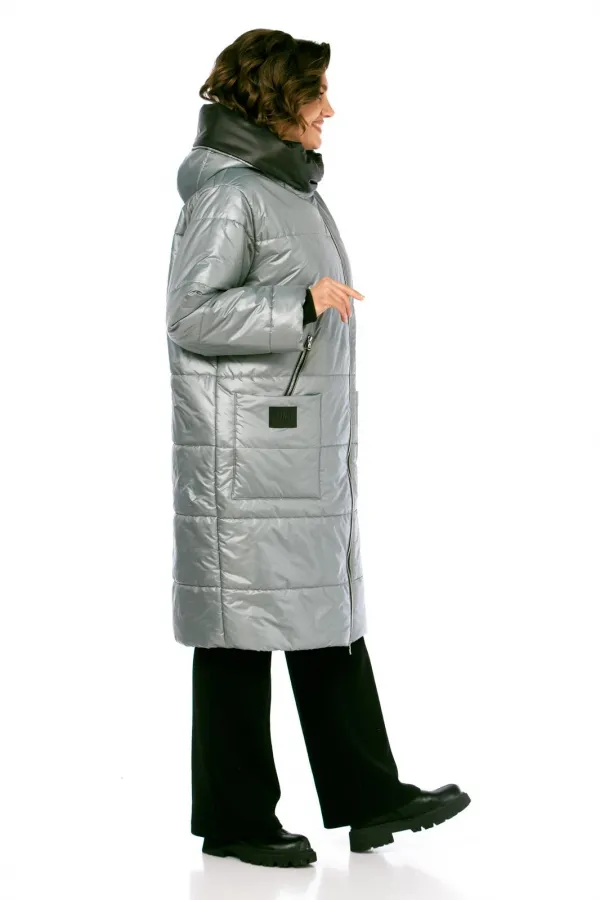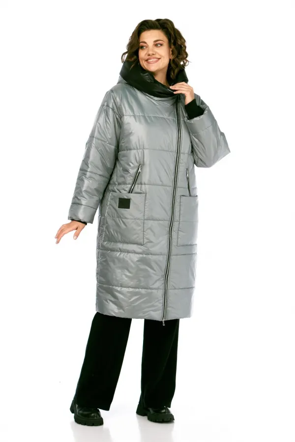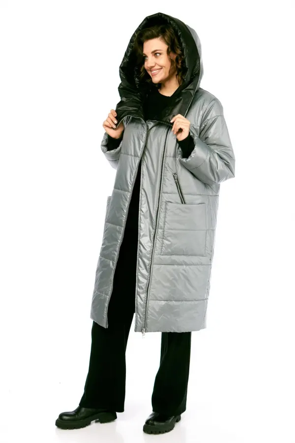 Пальто женское утепленное свободного кроя с ассиметричной застежкой на молнию. Перед с прорезными карманами с молнией и накладными карманами. Правый накладной карман с отделочной нашивкой. Рукав втачной одношовный с трикотажным манжетом выходящим из-под подгибки. Объмный капюшон выполнен из 2-ух видов ткани. Утеплитель Hoopon 200, температурный режим до -10 градусов.