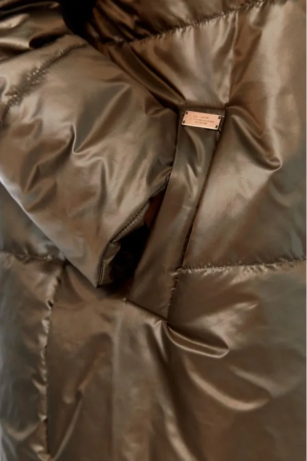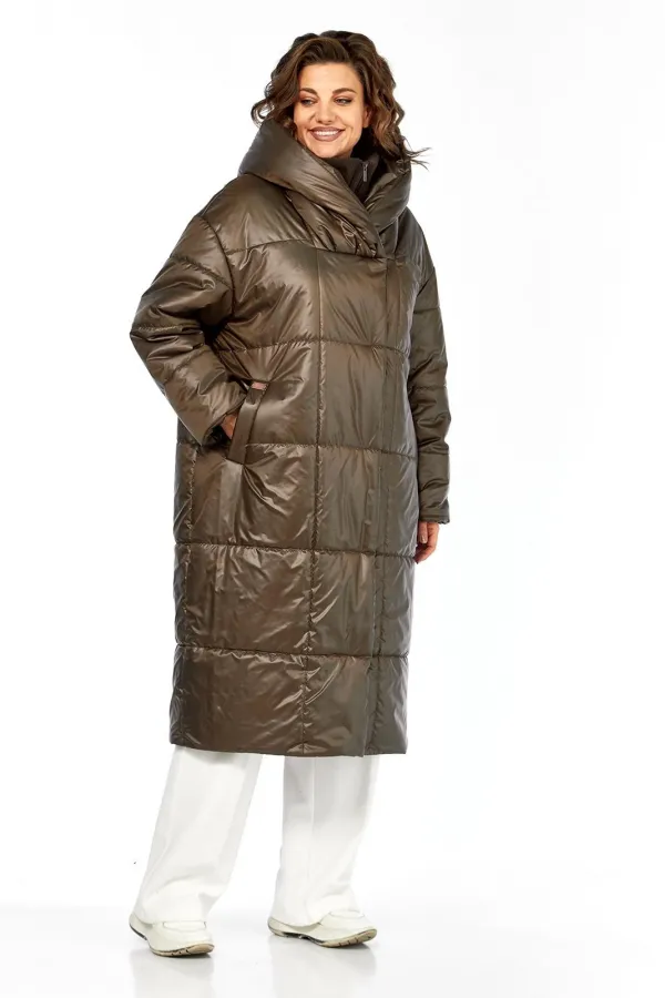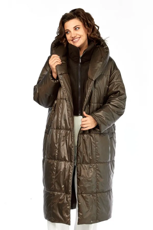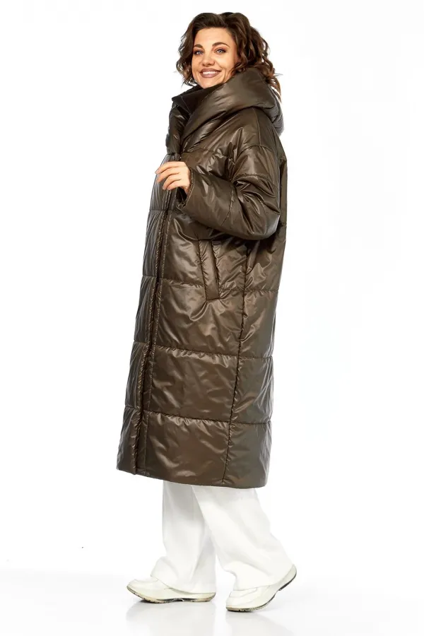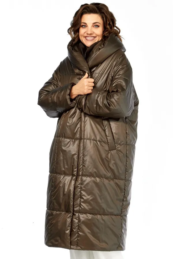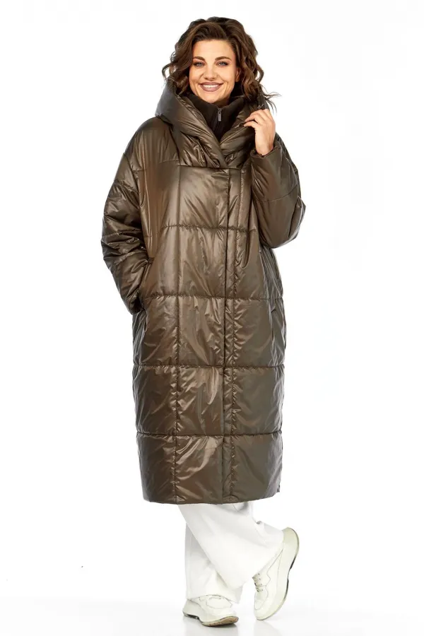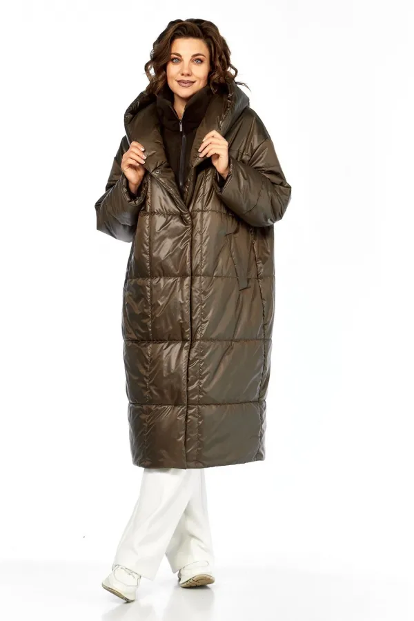 Пальто женскоеполуприлегающего силуэта со смещенной застежкой на кнопки. По переду прорезные карманы с листочкой. Рукав втачной одношовный с притачным манжетом по низу из отделочной ткани (довяз). Капюшон с объемный отделочной деталью по отлету, по горловине переда заложены складки. В качестве отделки используется манишка съемная с застежкой на тесьму-молнию (из отделочной ткани) фиксируется с помощью пуговиц и навесных петель-резинок на изделии. Используется утеплитель синтепон 200. Подходит под температурный режим до -10 градусов.Длина по спинке 116 см, длина рукава 54 см.
