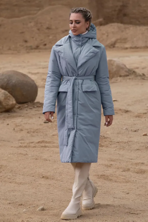 Описание внешнего вида: пальто утепленное, с центральной застежкой на пришивные кнопки, отложным воротником и лацканами. Перед отрезной по линии талии, в шве расположены карманы. Спинка цельная. Пальто со съемным капюшоном с манишкой. Пальто со съемным поясом.