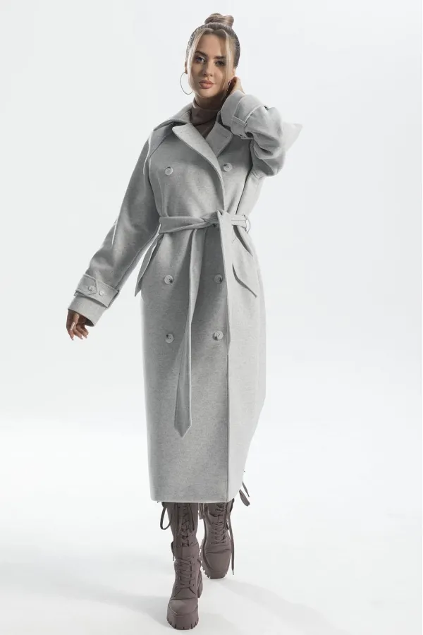 Пальто с центральной двубортной застежкой на петли и пуговицы, втачным воротником со стойкой и отложными лацканами. На полочках обработаны прорезные карманы с листочкой и клапаном. Спинка цельная. Рукав реглан, двухшовный. Пальто со съемным поясом.