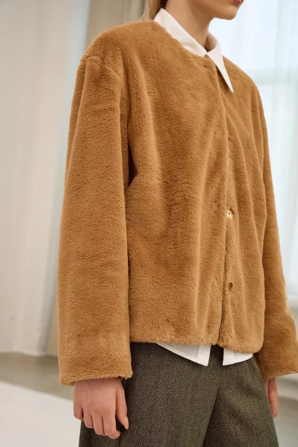 Полупальто выполнено из искусственного мехового полотна, свободного кроя, прямого силуэта, на подкладке. Линия плеча спущена, рукав длинный. Округлый вырез горловины на застежку на потайные кнопки.ПРЕДЗАКАЗ на 26.09.2025
