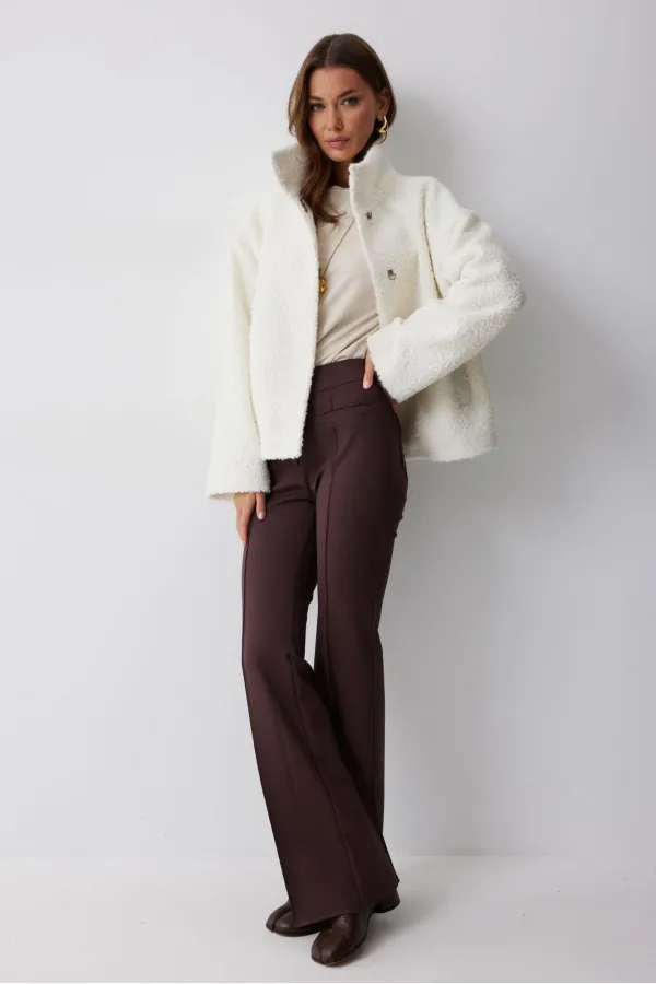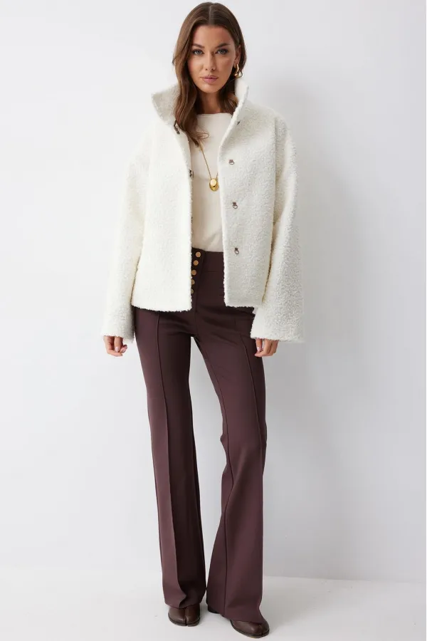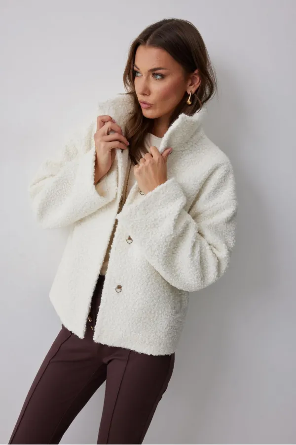 Жакет прямого силуэта из букле на трикотажной основе. Воротник-стойка. Центральная застежка на крючки. Рукав со спущенной линией плеча. По переду прорезные карманы. Жакет на подкладке. Обращаем ваше внимание, что фурнитура может отличаться от фото.