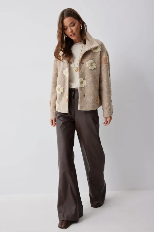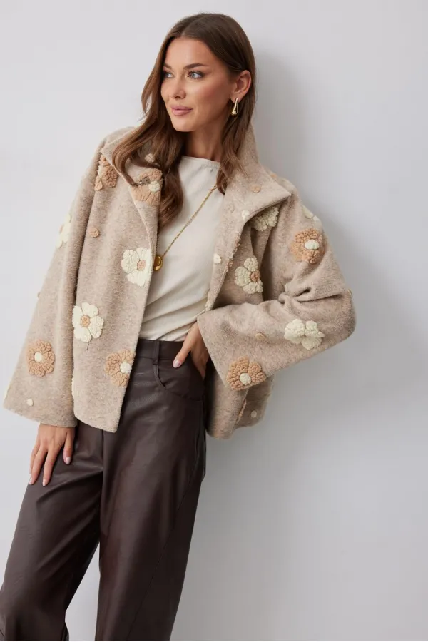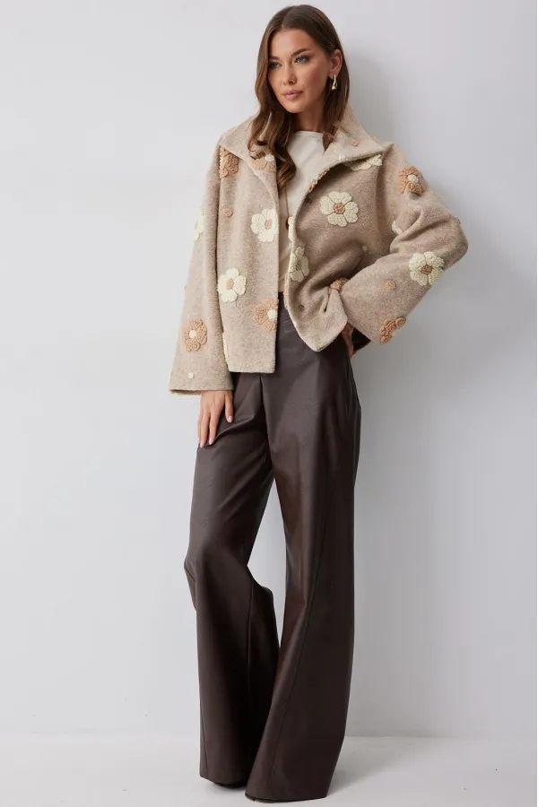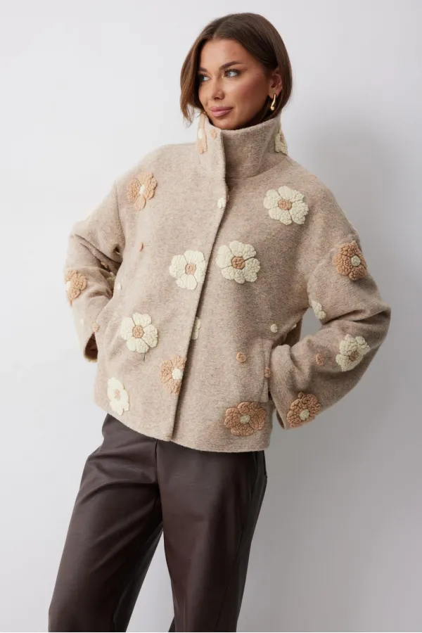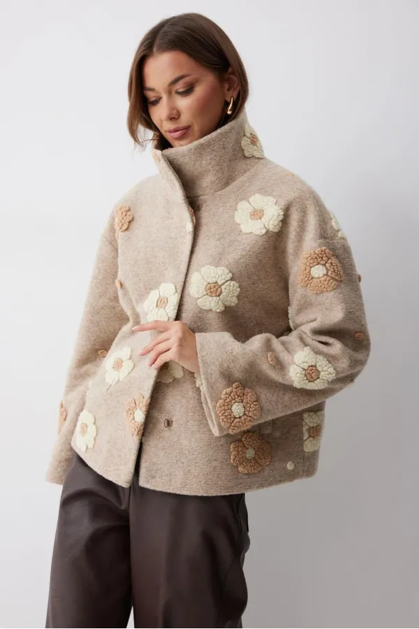 Жакет прямого силуэта из букле на трикотажной основе. Воротник-стойка. Центральная застежка на крючки. Рукав со спущенной линией плеча. По переду прорезные карманы. Жакет на подкладке. Обращаем ваше внимание, что фурнитура может отличаться от фото.