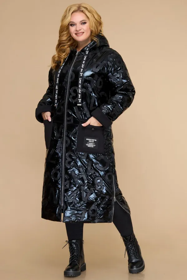 Пальто женское, прямого силуэта, со спущенной плечевой линией. По переду с накладными карманами с клапанами, которые застёгиваются на петлю и пуговицу, с центральной застёжкой на тесьму молнию. Рукав втачной, длинный, с отложной манжетой. По горловине капюшон с кулисой и декоративной тесьмой. В боковых швах разрезы с тесьмой молнией.