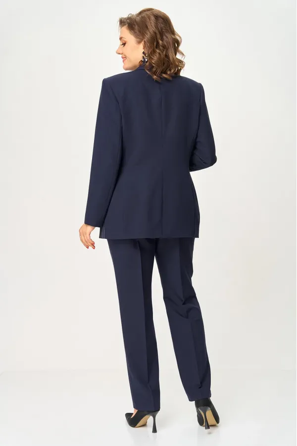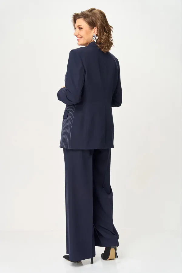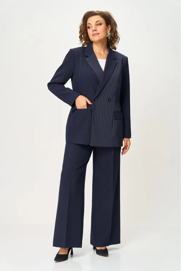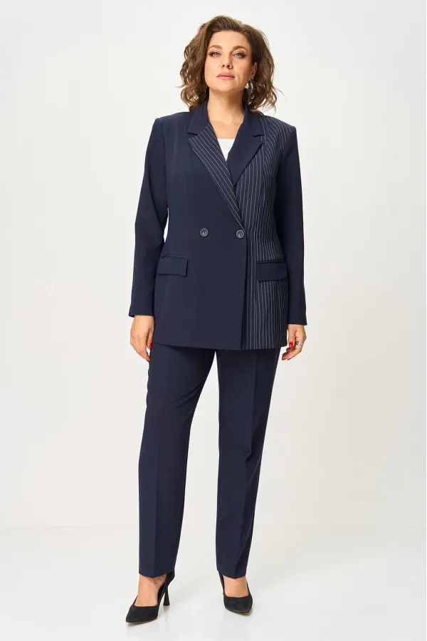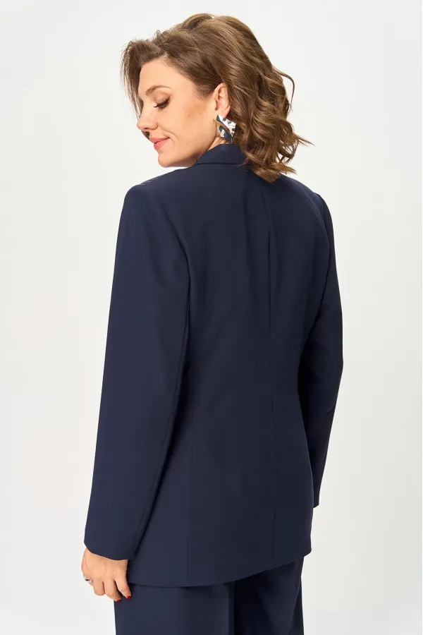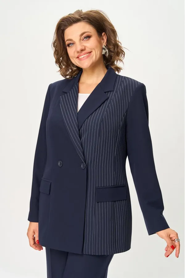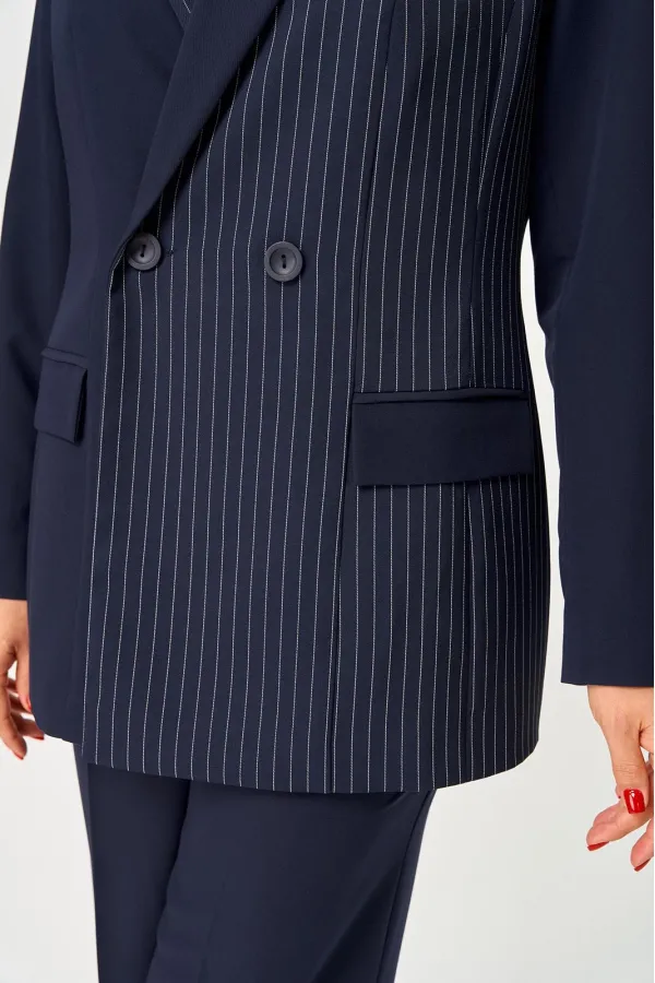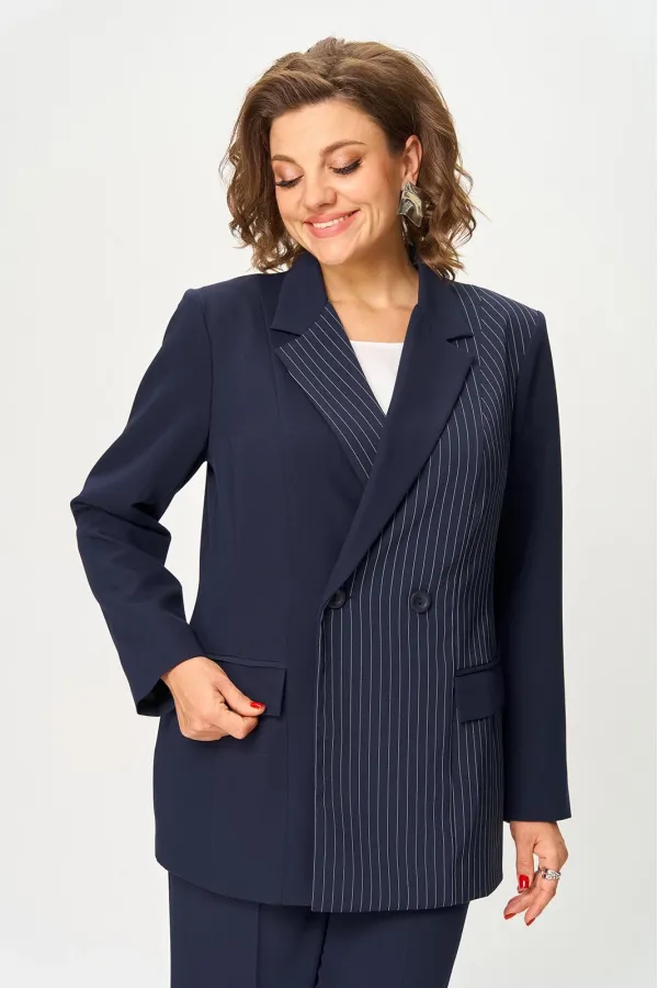 Полочка жакета с двубортной застежкой-трансформер на петли и пуговицы, вертикальными рельефами и прорезным карманом с клапаном. Левая полочка и лацкан правой полочки выполнены из отделочной ткани в полоску. Горловина V-образной формы, с отложными лацканами и воротником пиджачного типа. Спинка со средним швом и вертикальными рельефами. Рукав длинный, двухшовный, втачной.