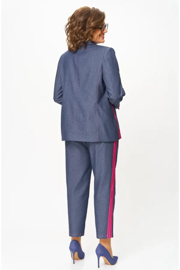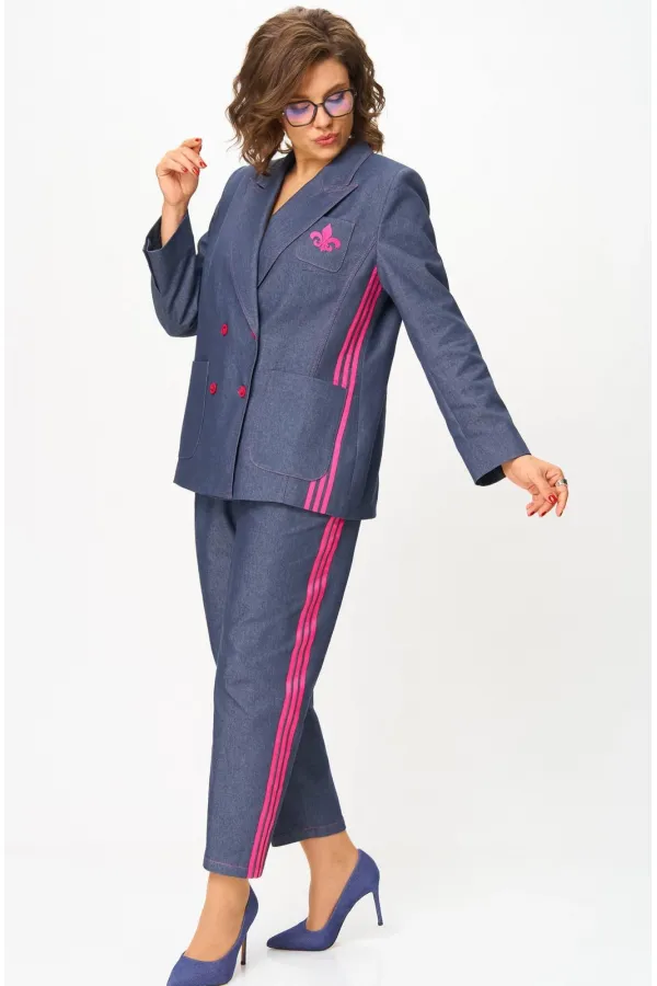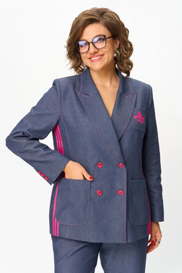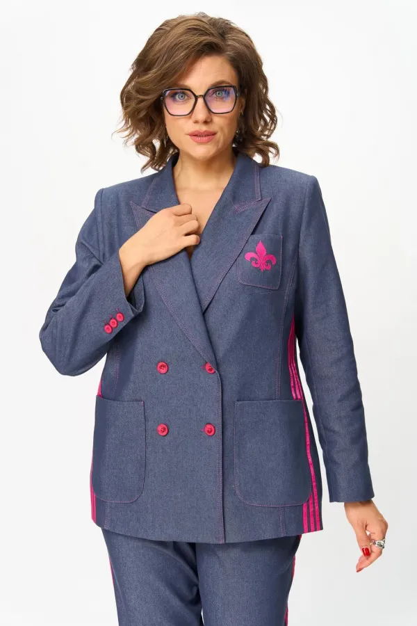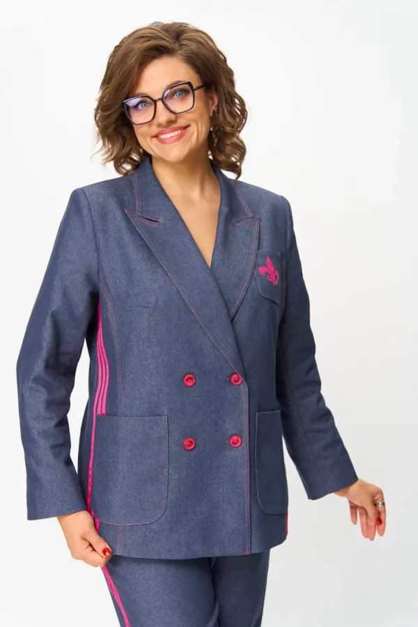Жакет с застёжкой спереди на петли и пуговицы, с пиджачным воротником и втачными двухшовными рукавами со шлицами и акцентными пуговицами. По переду выполнены боковые накладные карманы и нагрудный накладной карман с вышивкой, по боковым деталям переда три отделочные детали, спинка со швами. По деталям жакета проложены отделочные строчки контрастного цвета.