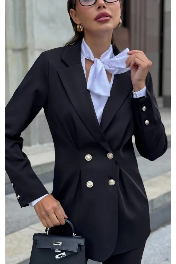 Жакет однобортный, на подкладке, обработаны защипы на линии талии. Воротник костюмный, рукав втачной, прямой, одношовный, обработан шлицей. Фурнитура - пуговицы золотистого цвета.