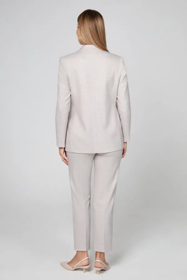 На передовой моды: модный однобортный жакет полуприлегающего силуэта с приятным рисунком в мелкую гусиную лапку, стильно подчёркнутый сочетанием карманов и интересным расположением пуговиц по борту. Приятная испанская ткань с добавлением вискозы прекрасно держит форму и обеспечивает свободу движений и комфорт. Рукава втачные двухшовные. На подкладке. Универсальный компаньон для множества нарядов.