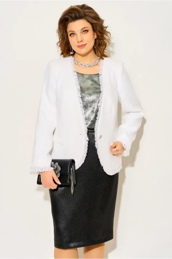Нарядный жакет Яника — твидовая классика с изюминкой. Элегантный жакет полуприлегающего силуэта выполнен из твидовой ткани с флоковой нитью, жакет на подкладке. Однобортная застёжка на пуговицу, рельефные линии по поло... Читать далее...