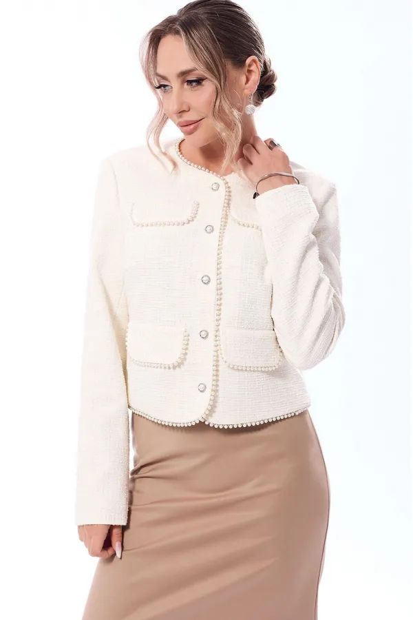Жакет прямого силуэта с центральной застежкой на петли и пуговицы, без воротника, с круглым вырезом горловины. По переду с нагрудными вытачками. На уровне груди и линии талии расположены настрочные клапаны . Спинка со средним швом. Рукав втачной, длинный. Вдоль линии борта, горловины и клапанов- декоративная тесьма с бусинами.