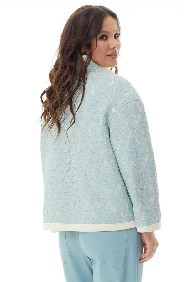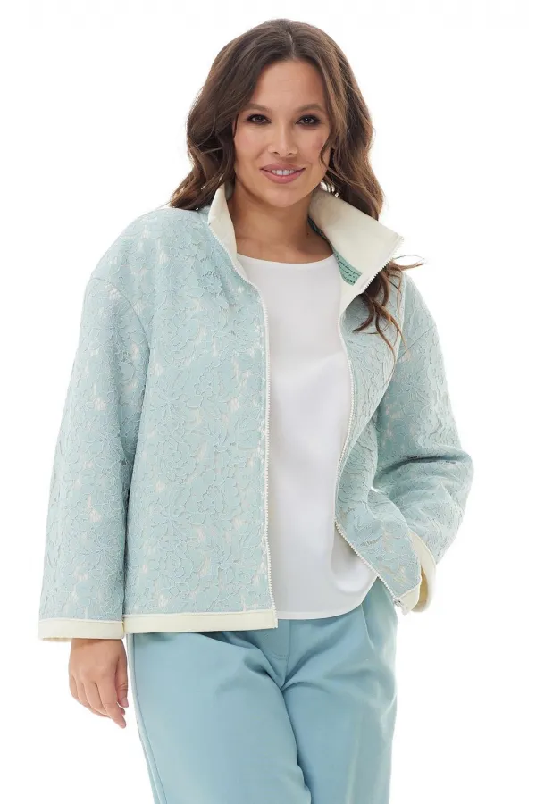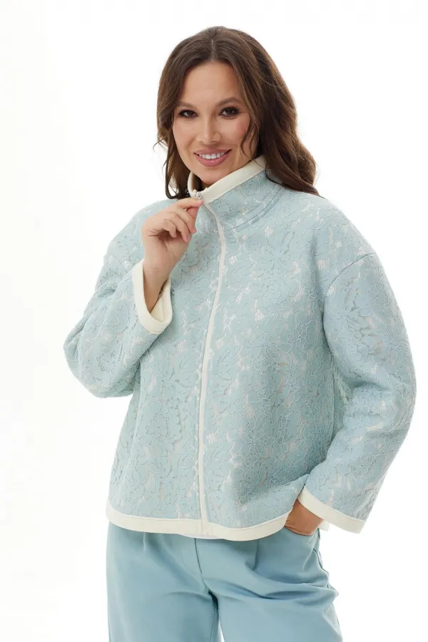 Стильный и невероятно красивый бомбер свободного кроя с центральной застежкой на молнию. Выполнен из однотонного качественного плотного трикотажного полотна (футер) с наложенным на него кружевом. За счет наложения разных фактур ткани и цветов создается необычный 3D эффект. Рукав длинный, втачной, слегка спущен. Горловина обработана стойкой. Длина бомбера от плечевого шва 60 см. Длина рукава 60 см.