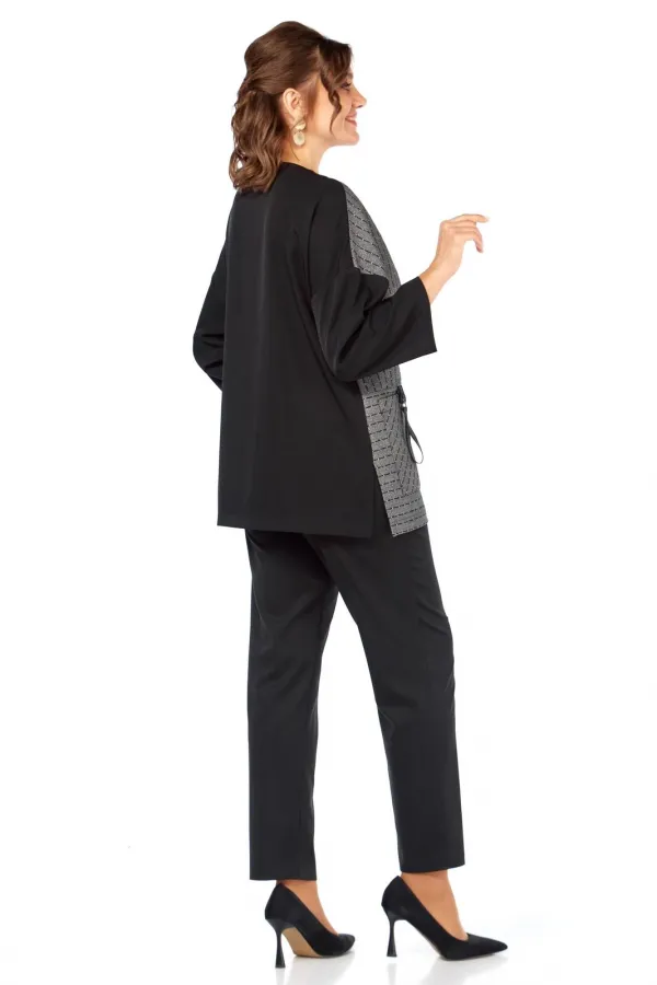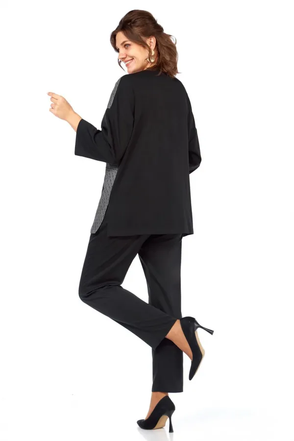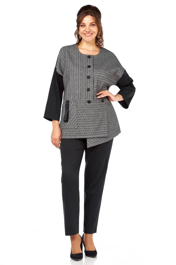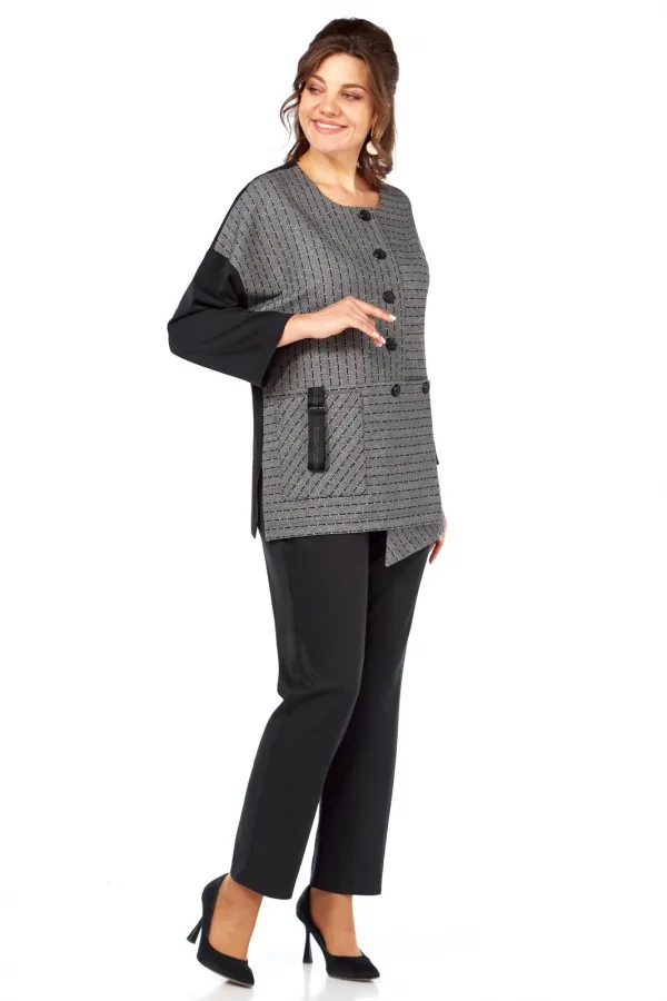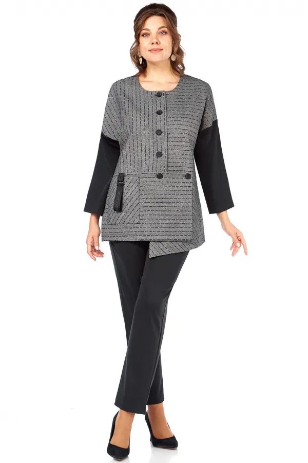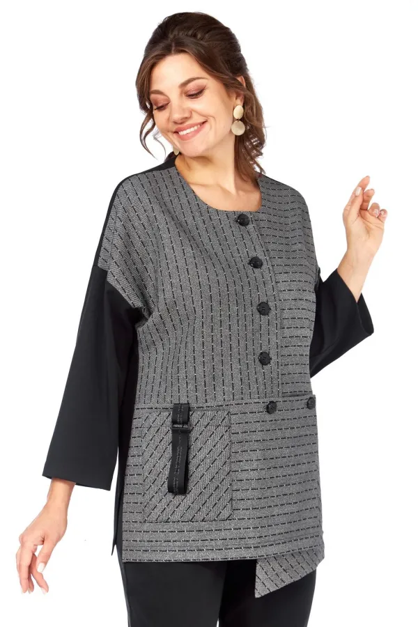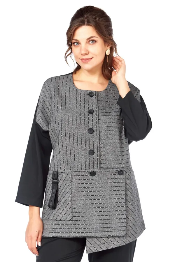 Жакет женский, с цельнокроеным рукавом длиной 3/4, округлым вырезом горловины. Центральная застёжка симметрична до линии талии, низ переда асимметричен. По полочке, справа, имеется накладной карман с декоративной патой. Спинка и отрезная деталь рукава из однотонного трикотажного полотна
