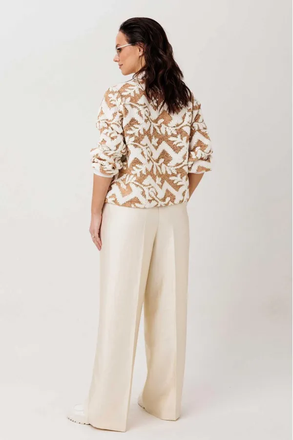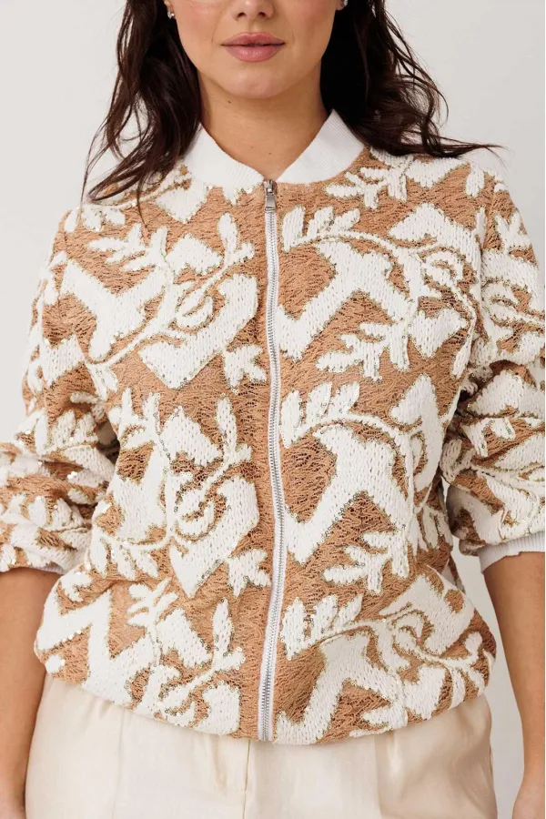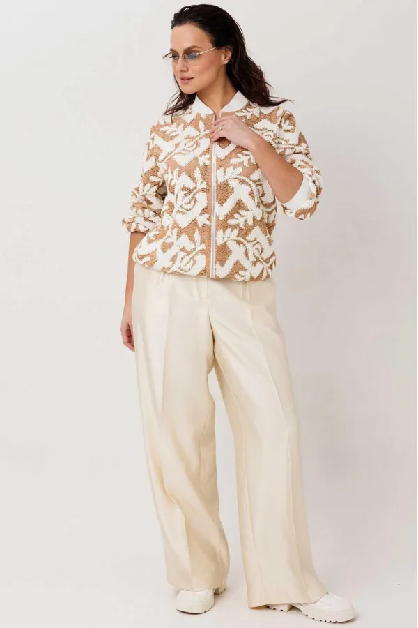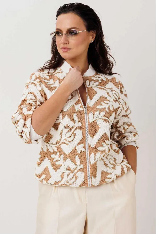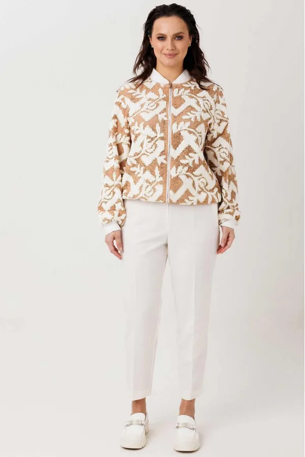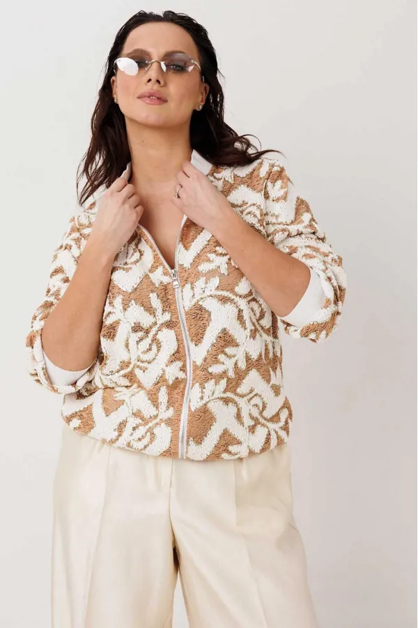Жакет-бомбер с выразительной фактурой без подкладки. Стильный бомбер, который легко становится акцентом в образе. Объёмная фактурная ткань с контрастным узором создаёт эффект глубины и делает модель заметной, но при этом остаётся универсальной для повседневных сочетаний. Свободный силуэт мягко садится по фигуре, а притачная планка по низу с эластичной тесьмой формирует аккуратную линию и добавляет удобства в носке.