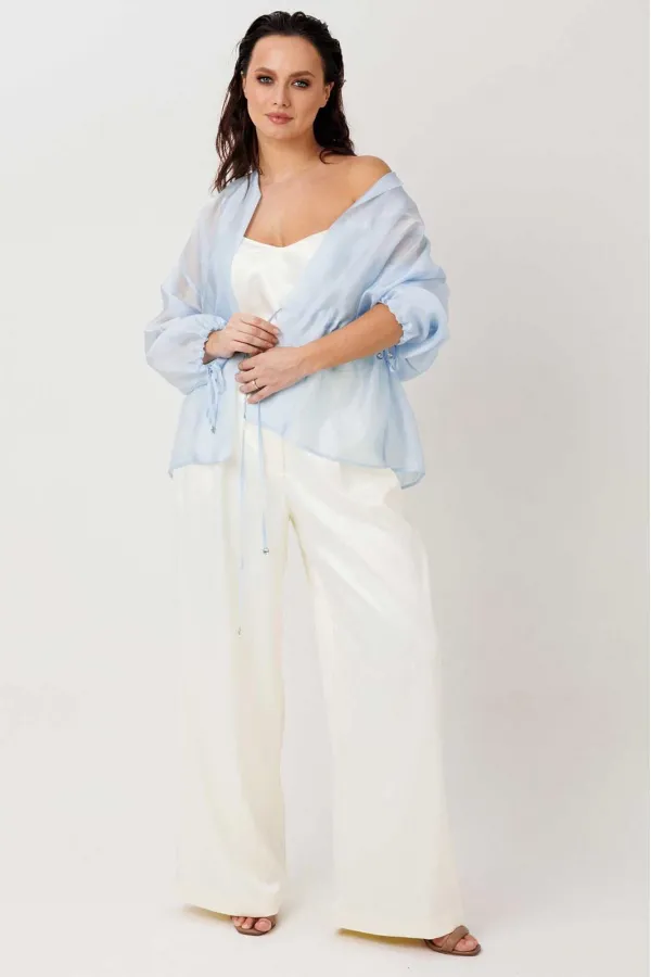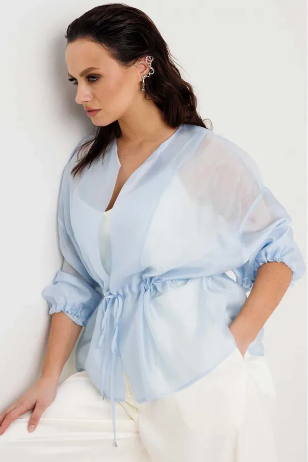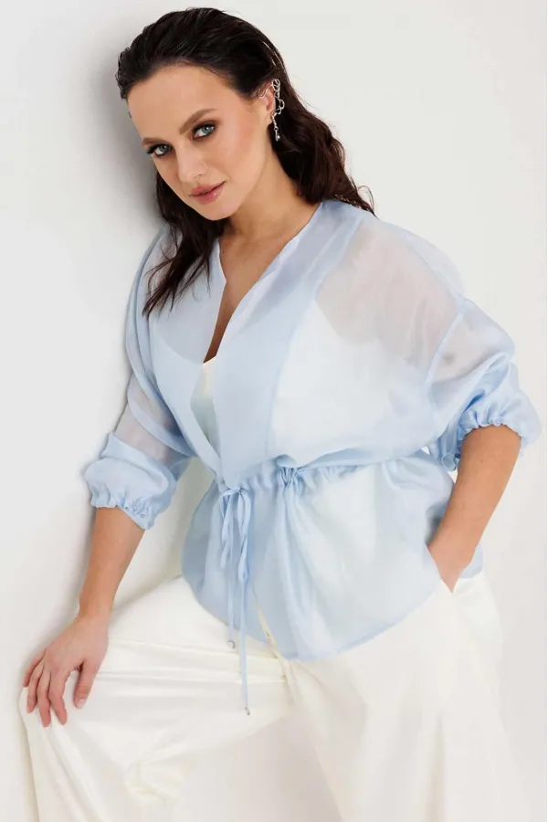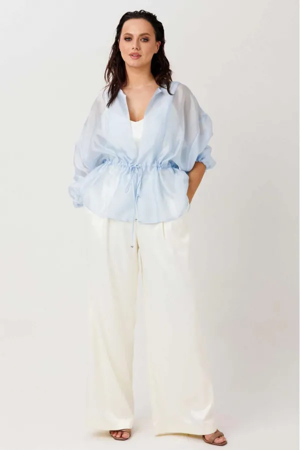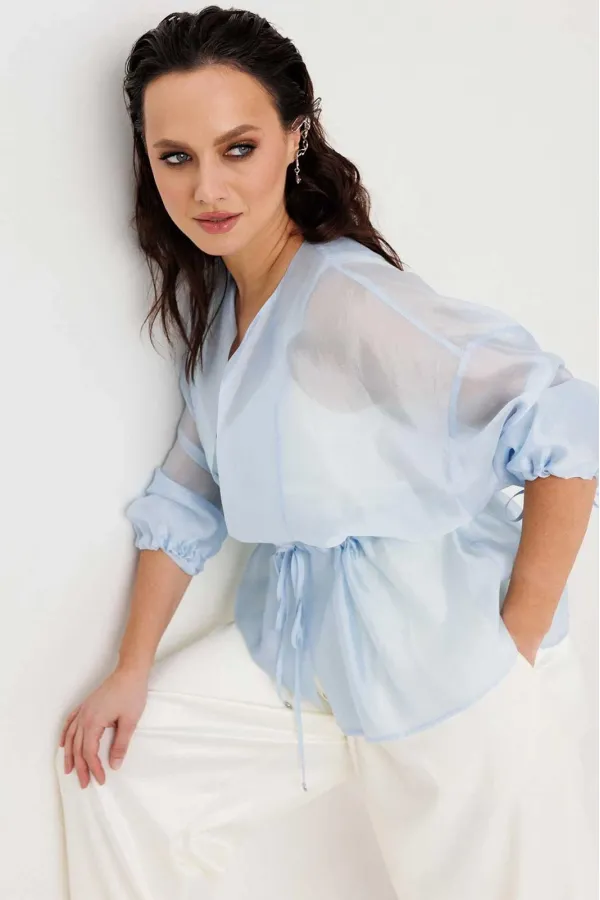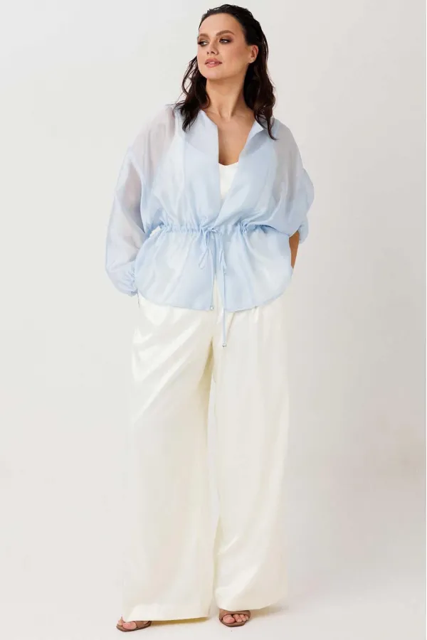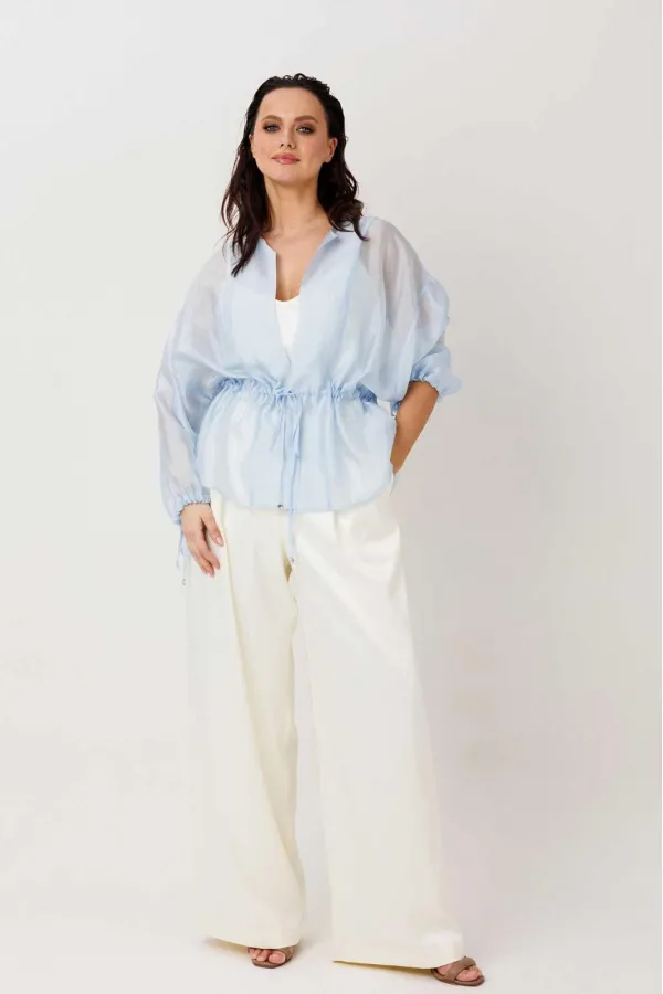 Воздушная блуза свободного прямого силуэта, которая мягко струится по фигуре и создаёт ощущение лёгкости в каждом движении. Модель без застёжки — удобно надевается и идеально подходит для расслабленных, но стильных образов. Ткань с тонким блеском и деликатным узором добавляет изысканности, делая образ более нарядным без лишней перегруженности. Линия талии регулируется за счёт кулиски — можно подчеркнуть силуэт или оставить свободную посадку. Объёмные рукава усиливают эффект лёгкости и придают модели современное звучание.